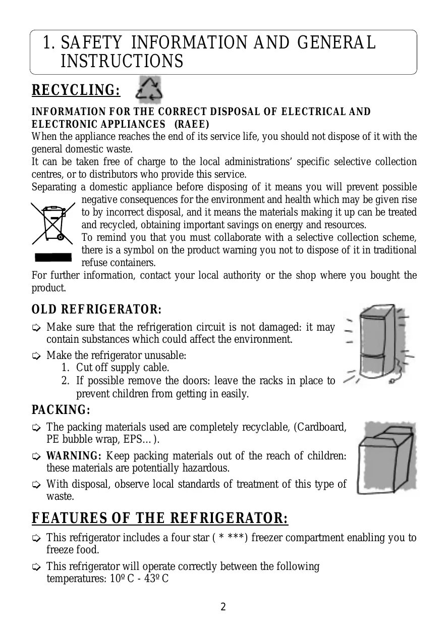 ➭ This refrigerator includes a four star ( * ***) freezer compartment enabling you to freeze food. ➭ This refrigerator will operate correctly between the following temperatures: 10º C - 43º C 2