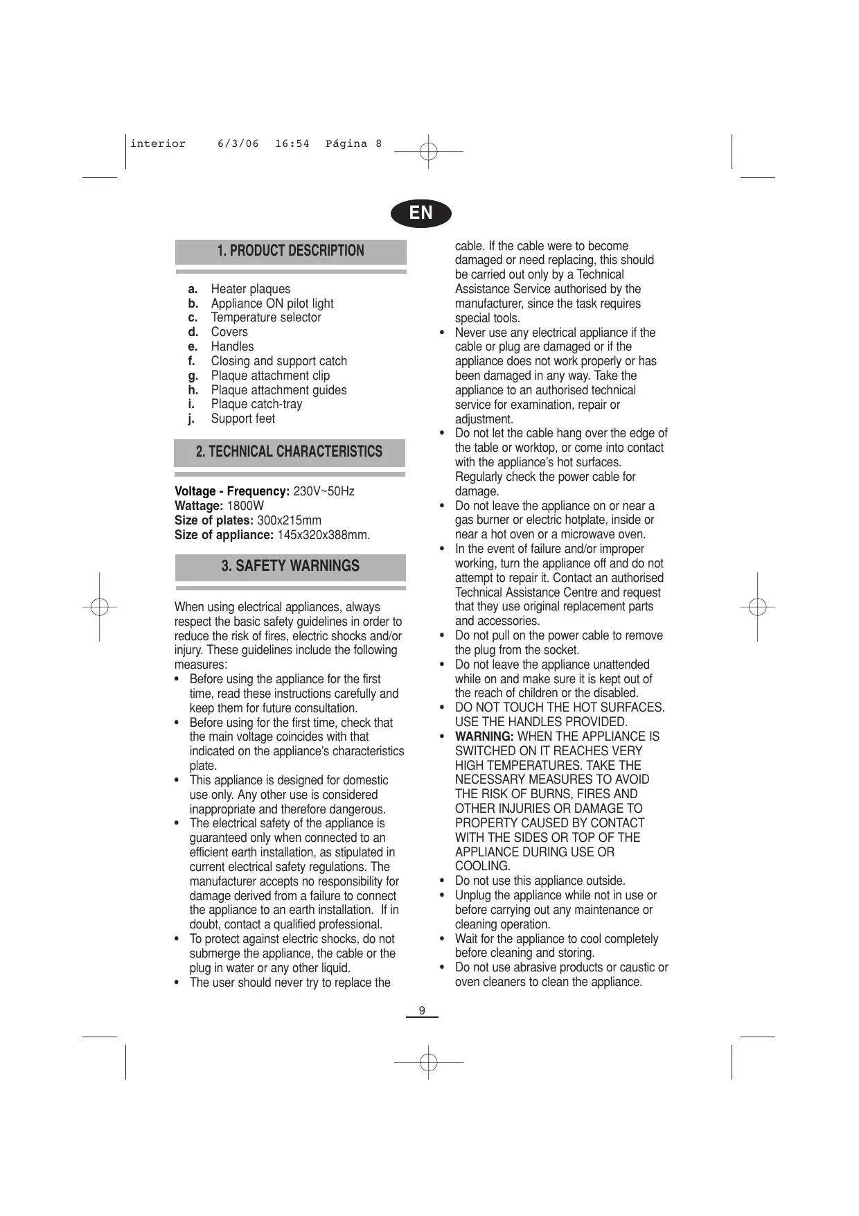 COOLING. Do not use this appliance outside. Unplug the appliance while not in use or before carrying out any maintenance or cleaning operation. Wait for the appliance to cool completely before cleaning and storing. Do not use abrasive products or caustic or oven cleaners to clean the appliance. interior 6/3/06 16:54 Página 9 the upper cover up as far as it will go, before folding it down once again until it rests firmly on its supports. The upper plaque is thus suspended directly over the lower one. (Fig. 4) This position is used for au gratin dishes, reheating and, in general, for using the grill like a conventional oven.