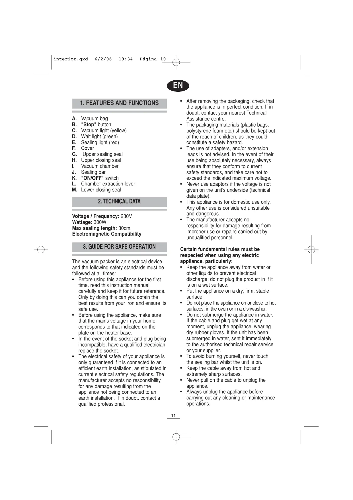Voltage / Frequency: 230V Wattage: 300W Max sealing length: 30cm Electromagnetic Compatibility Certain fundamental rules must be respected when using any electric appliance, particularly: