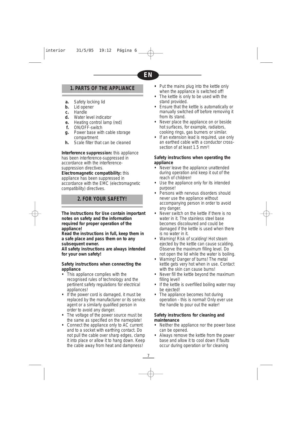 Safety locking lid Lid opener Handle Water level indicator Heating control lamp (red) ON/OFF-switch Power base with cable storage compartment Scale filter that can be cleaned Interference suppression: this appliance has been interference-suppressed in accordance with the interferencesuppression directives. Electromagnetic compatibility: this appliance has been suppressed in accordance with the EMC (electromagnetic compatibility) directives. Safety instructions when operating the appliance