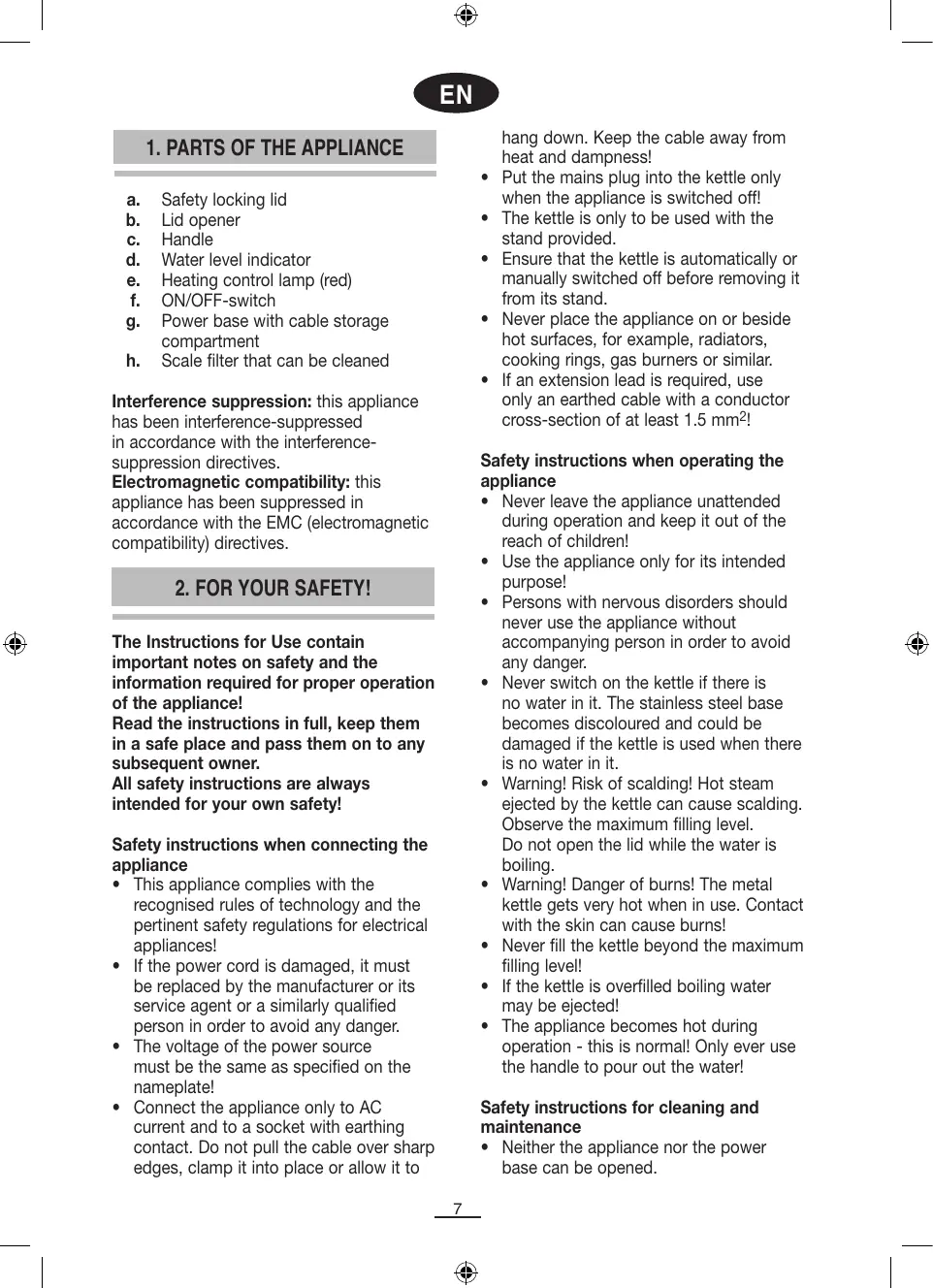 Interference suppression: this appliance has been interference-suppressed in accordance with the interferencesuppression directives. Electromagnetic compatibility: this appliance has been suppressed in accordance with the EMC (electromagnetic compatibility) directives. hang down. Keep the cable away from heat and dampness! Put the mains plug into the kettle only when the appliance is switched off! The kettle is only to be used with the stand provided. Ensure that the kettle is automatically or manually switched off before removing it from its stand. Never place the appliance on or beside hot surfaces, for example, radiators, cooking rings, gas burners or similar. If an extension lead is required, use only an earthed cable with a conductor cross-section of at least 1.5 mm2! Safety instructions when operating the appliance