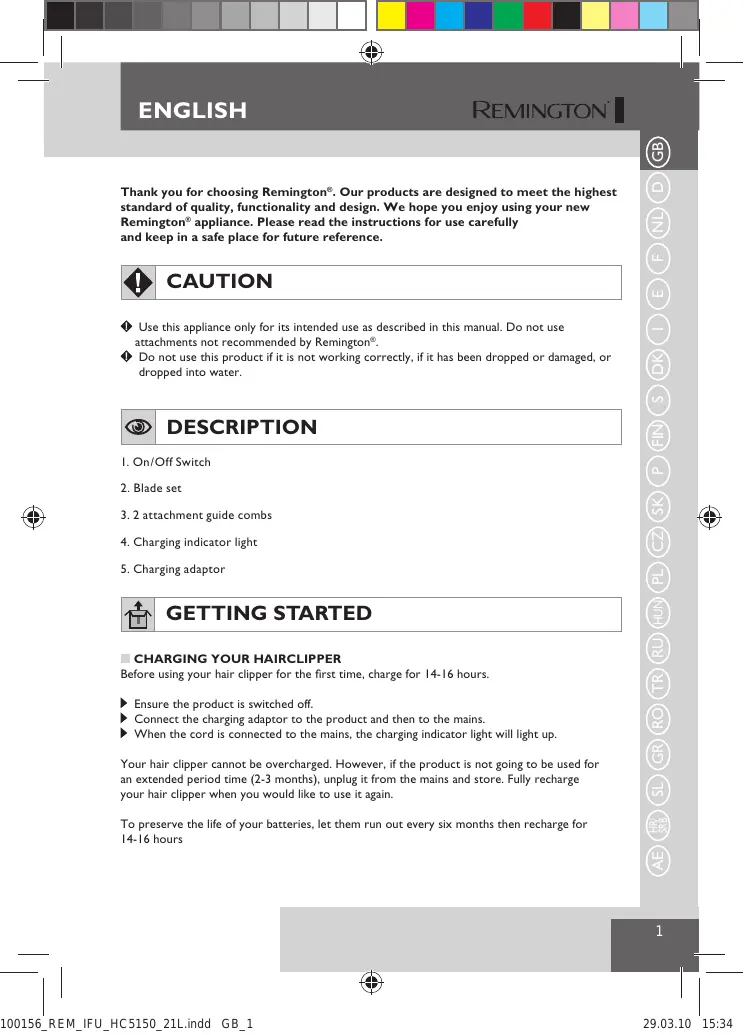 10/INT/HC5150 Version 05 /10 Part No. T22-29490 REMINGTON® is a Registered Trade Mark of Spectrum Brands, Inc., or one of its subsidiaries VARTA Consumer Batteries GmbH & Co. KGaA Alfred-Krupp-Str.9 73479 Ellwangen Germany www.remington-europe.com © 2010 SBI Mo.-Fr. 9 a.m. – 5 p.m. Central European Time (free call) E-Mail: service@remington-europe.com www.remington-europe.com Tel. 00800 821 700 82 (free call) Tel. +44 0800 212 438 (free call) Rayovac Europe Ltd, Watermans House, Kingsbury Crescent, The Causeway, Staines, Middlesex, TW18 3BA, UNITED KINGDOM, www.remington.co.uk ČESKÁ REPUBLIKA Tel. +420 487 754 605 Remington Consumer Products, Unit 7C, Riverview Business Park, New Nangor Road, Dublin 22, IRELAND, www.remington.co.uk MAGYARORSZÁG