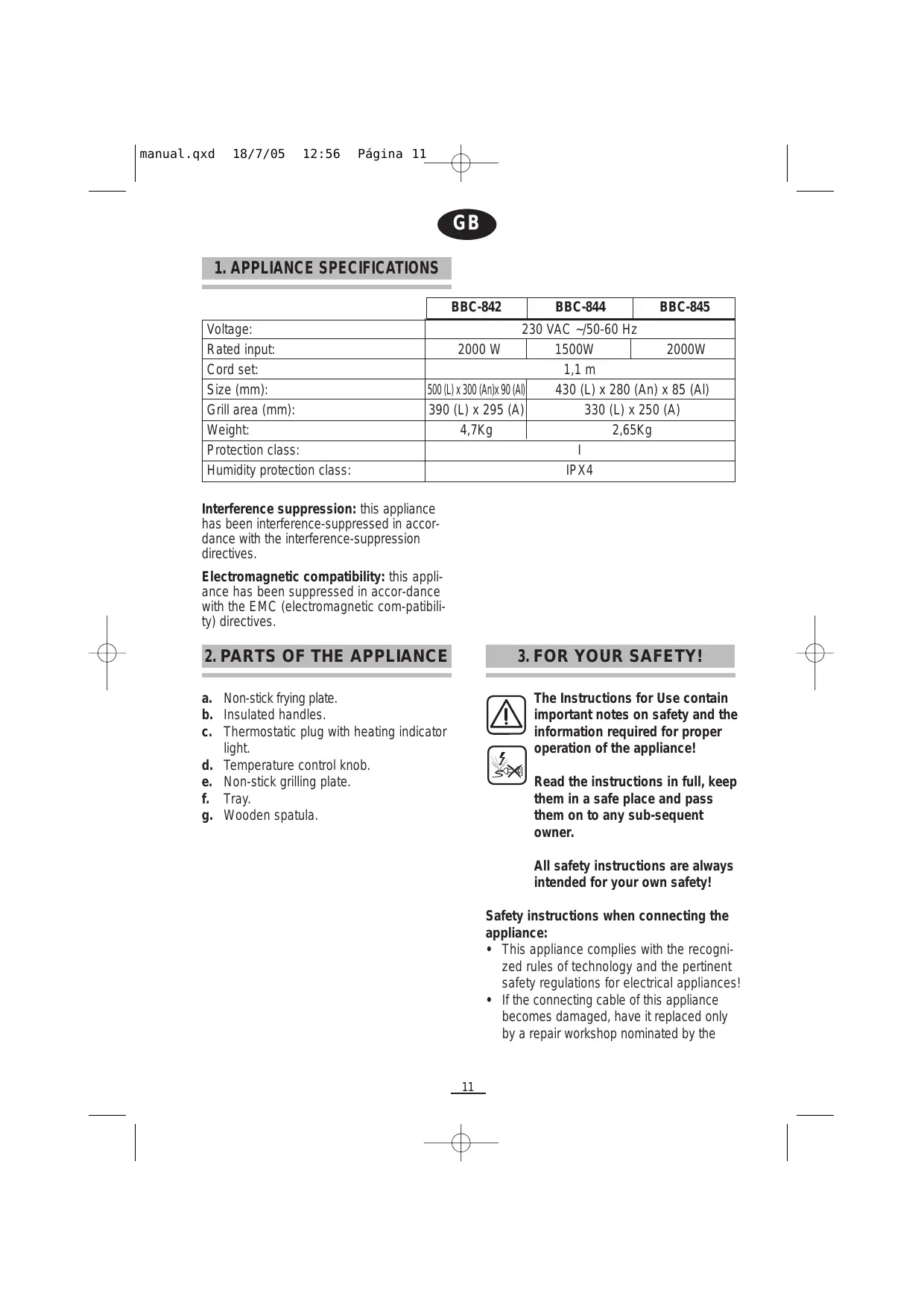 1. APPLIANCE SPECIFICATIONS BBC-842 Voltage: Rated input: Cord set: Size (mm): Grill area (mm): Weight: Protection class: Humidity protection class: