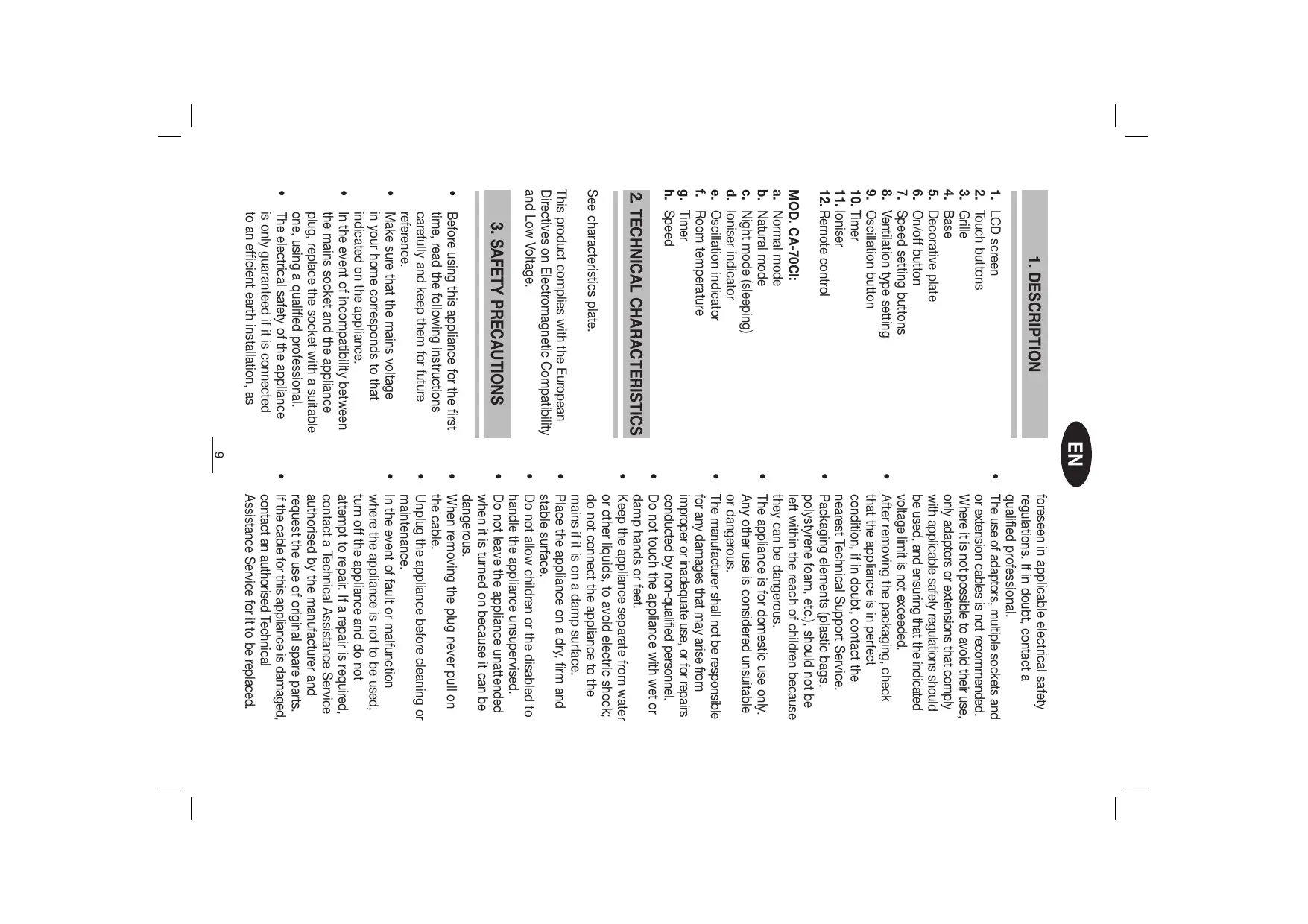These are “natural” and “night” ventilation type operating modes according to the speed selected: [ NATURAL MODE Low speed Medium speed High Medium Low speed High Medium Low NIGHT MODE Low speed Medium speed High Medium Low speed High Medium Low © Oscillation: Press the oscillation button (9) (mod. CA-70CI “e”) (on illation light iight up) to make the fan oscillate horizontally and thereby cool larger spaces more efficiently. 1f you wish to stop oscillation, press the same button again. imer: Mod. CA-60C © Pres the timer button (10) if you Wish to select an operating period of 12 hour to 7 1/2 hours. Each time you press the timer button, the time Will increase by 12 hour. Once you reach 7 1/2 hours, press the timer button (10) again and the fan will return to continuous operation. The ndicate the me period selected. Once the time selected is exceeded, the fan wil switch off automatic. Mod. CA-70C This fan has a timer range of 1 to 18 hours (g). You may set it for the fan to go off automatically after the programmed operation time. Press the timer button (10) to set the time. Each time you press the button the time will increase by haïf an hour. Stop pressing it when you reach the desired time and the timer will set itself. To cancel the timer, press the button until it reaches 0:00. © loniser: Press this button (11) to ate the ioniser function. The fan emit negative ions to clean and purify the air. Mod. CA-60C — The light wi indicate whether or not this function is activated. Mod. CA-70 CI — The ion indicator will appear on the LCD screen (d). Press the button again to deactivate this function.