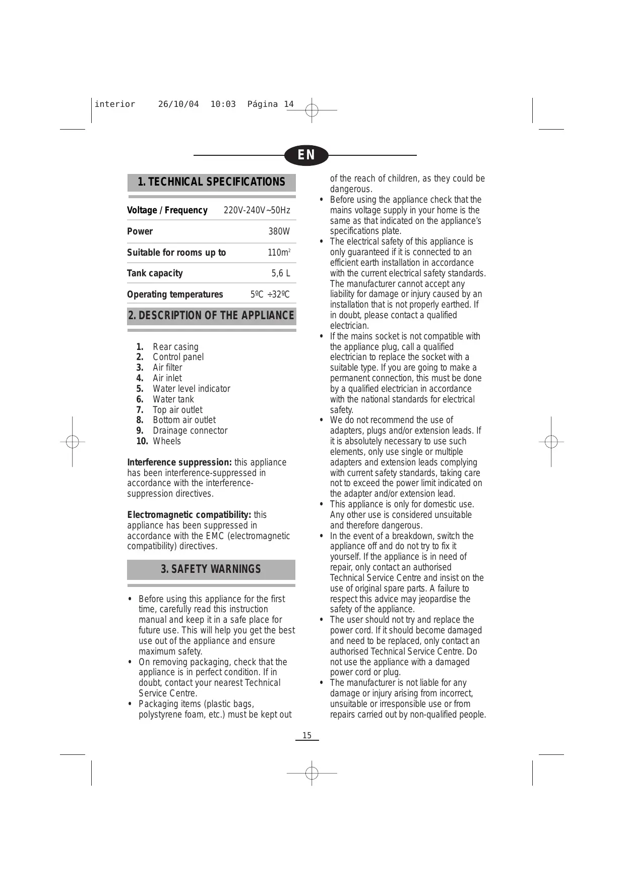 of the reach of children, as they could be dangerous. Before using the appliance check that the mains voltage supply in your home is the same as that indicated on the appliance’s specifications plate. The electrical safety of this appliance is only guaranteed if it is connected to an efficient earth installation in accordance with the current electrical safety standards. The manufacturer cannot accept any liability for damage or injury caused by an installation that is not properly earthed. If in doubt, please contact a qualified electrician. If the mains socket is not compatible with the appliance plug, call a qualified electrician to replace the socket with a suitable type. If you are going to make a permanent connection, this must be done by a qualified electrician in accordance with the national standards for electrical safety. We do not recommend the use of adapters, plugs and/or extension leads. If it is absolutely necessary to use such elements, only use single or multiple adapters and extension leads complying with current safety standards, taking care not to exceed the power limit indicated on the adapter and/or extension lead. This appliance is only for domestic use. Any other use is considered unsuitable and therefore dangerous. In the event of a breakdown, switch the appliance off and do not try to fix it yourself. If the appliance is in need of repair, only contact an authorised Technical Service Centre and insist on the use of original spare parts. A failure to respect this advice may jeopardise the safety of the appliance. The user should not try and replace the power cord. If it should become damaged and need to be replaced, only contact an authorised Technical Service Centre. Do not use the appliance with a damaged power cord or plug. The manufacturer is not liable for any damage or injury arising from incorrect, unsuitable or irresponsible use or from repairs carried out by non-qualified people. interior 26/10/04 10:03 Página 15 When using electrical appliances, a series of basic rules of safety must be followed.