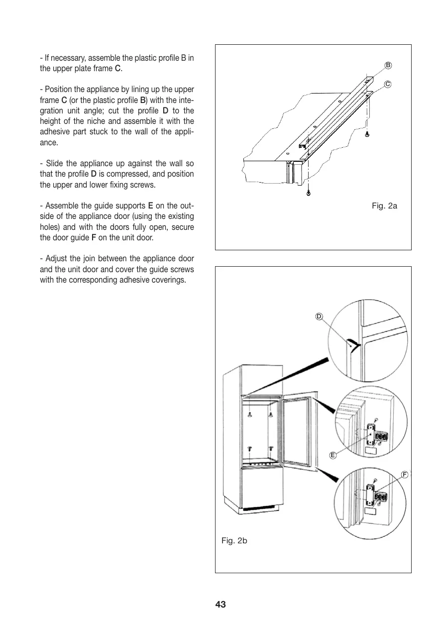 (par l’intermédiaire des trous) et, les portes étant entièrement ouvertes, fixez le rail de la porte F dans la porte du meuble. - Faites coïncider la porte du réfrigérateur et le meuble, puis recouvrez les vis du rail avec les capuchons adhésifs correspondants.