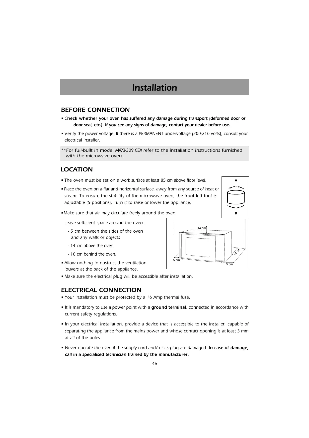 **For full-built in model MW3-309 CEX refer to the installation instructions furnished with the microwave oven.