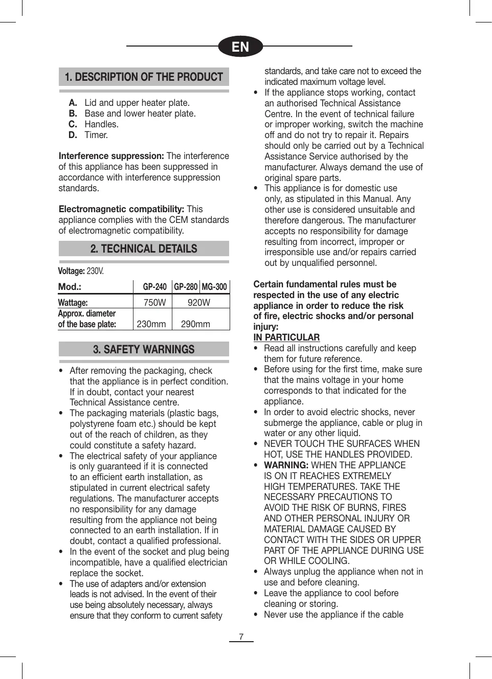 Lid and upper heater plate. Base and lower heater plate. Handles. Timer. Interference suppression: The interference of this appliance has been suppressed in accordance with interference suppression standards. Electromagnetic compatibility: This appliance complies with the CEM standards of electromagnetic compatibility. Wattage: Approx. diameter of the base plate: 750W 920W 230mm 290mm Certain fundamental rules must be respected in the use of any electric appliance in order to reduce the risk of fire, electric shocks and/or personal injury: IN PARTICULAR