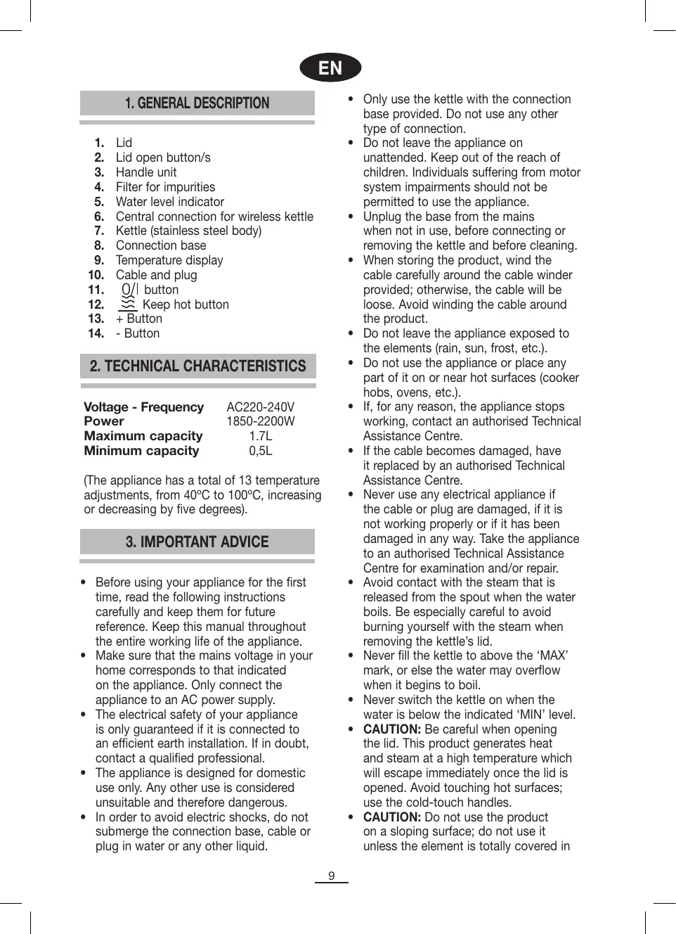 EN • Only use the kettle with the connection base provided. Do not use any other type of connection. • Do not leave the appliance on unattended. Keep out of the reach of children. Individuals suffering from motor system impairments should not be permitted to use the appliance. • Unplug the base from the mains when not in use, before connecting or removing the kettle and before cleaning. • When storing the product, wind the cable carefully around the cable winder provided; otherwise, the cable will be loose. Avoid winding the cable around the product. • Do not leave the appliance exposed to the elements (rain, sun, frost, etc.). • Do not use the appliance or place any part of it on or near hot surfaces (cooker hobs, ovens, etc.). • If, for any reason, the appliance stops working, contact an authorised Technical Assistance Centre. • If the cable becomes damaged, have it replaced by an authorised Technical Assistance Centre. • Never use any electrical appliance if the cable or plug are damaged, if it is not working properly or if it has been damaged in any way. Take the appliance to an authorised Technical Assistance Centre for examination and/or repair. • Avoid contact with the steam that is released from the spout when the water boils. Be especially careful to avoid burning yourself with the steam when removing the kettle’s lid. • Never fill the kettle to above the ‘MAX’ mark, or else the water may overflow when it begins to boil. • Never switch the kettle on when the water is below the indicated ‘MIN’ level. • CAUTION: Be careful when opening the lid. This product generates heat and steam at a high temperature which will escape immediately once the lid is opened. Avoid touching hot surfaces; use the cold-touch handles. • CAUTION: Do not use the product on a sloping surface; do not use it unless the element is totally covered in