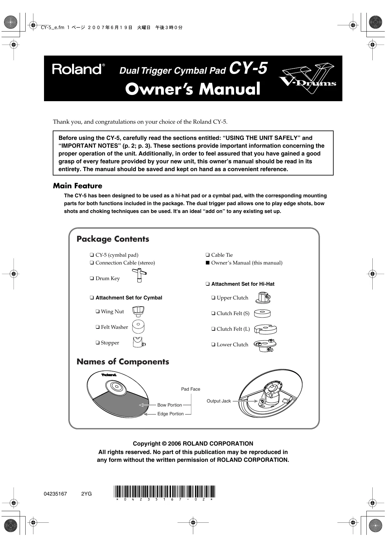 4 _+||@ F7 TT efm 1 A 2007#6A19H XRH +FK3HOS Roland’ Dual Trigger Cymbal Pad CY 5 Owner'’s Manual Thank you, and congratulations on your choice of the Roland CY-5. Before using the CY-5, carefully read the sections entitled: “USING THE UNIT SAFELY” and “IMPORTANT NOTES” (p. 2; p. 3). These sections provide important information concerning the proper operation of the unit. Additionally, in order to feel assured that you have gained a good grasp of every feature provided by your new unit, this owner’s manual should be read in its entirety. The manual should be saved and kept on hand as a convenient reference. Main Feature The CY-5 has been designed to be used as a hi-hat pad or a cymbal pad, with the corresponding mounting parts for both functions included in the package. The dual trigger pad allows one to play edge shots, bow shots and choking techniques can be used. It's an ideal “add on” to any existing set up.