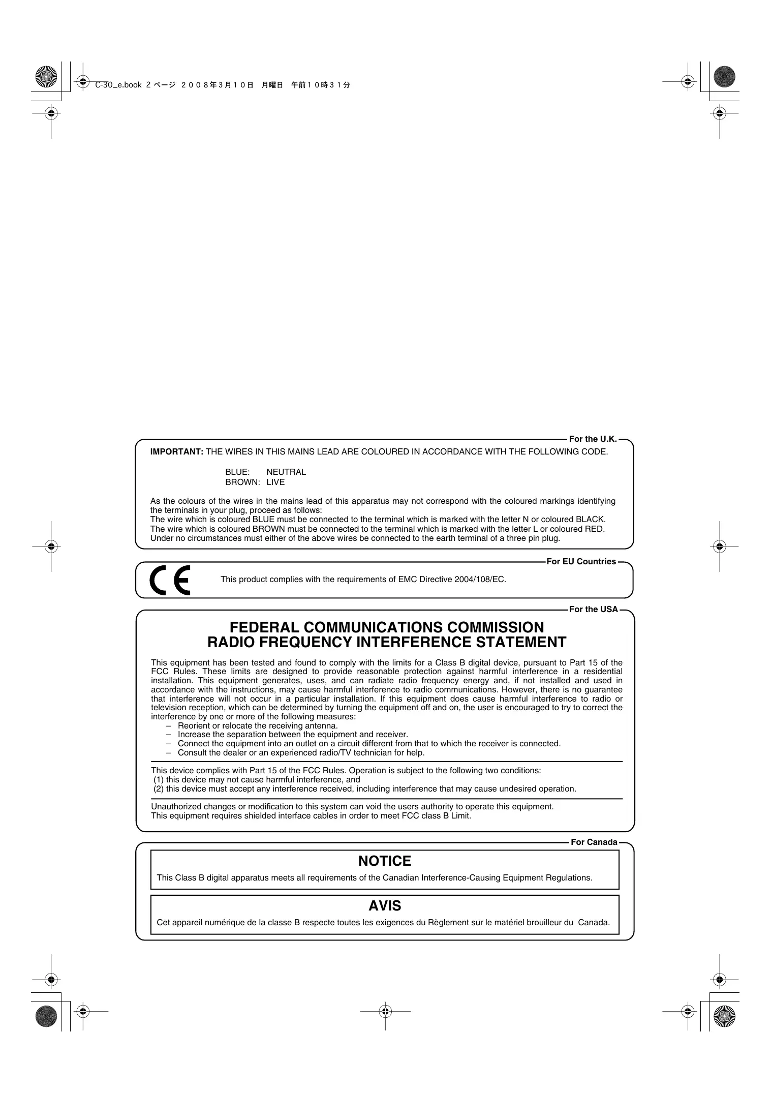 CIE T-30_e.book 2 X— 2008#Æ3A10R AA ÆH10H31% For the UK. IMPORTANT: THE WIRES IN THIS MAINS LEAD ARE COLOURED IN ACCORDANCE WITH THE FOLLOWING CODE. BLUE: NEUTRAL BROWN: LIVE As the colours of the wires in the mains lead of this apparatus may not correspond with the coloured markings identifying the terminals in your plug, proceed as follows: The wire which is coloured BLUE must be connected to the terminal which is marked with the letter N or coloured BLACK. The wire which is coloured BROWN must be connected to the terminal which is marked with the letter L or coloured RED. Under no circumstances must either of the above wires be connected to the earth terminal of a three pin plug. D. For EU Countries — ( € This product complies with the requirements of EMC Directive 2004/108/EC. For the USA