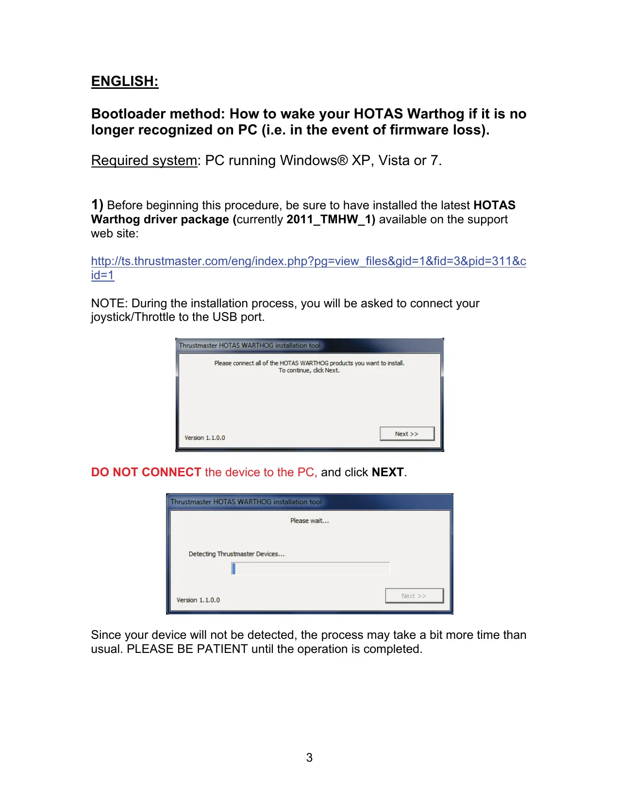 Bootloader method: How to wake your HOTAS Warthog if it is no longer recognized on PC (i.e. in the event of firmware loss). Required system: PC running Windows® XP, Vista or 7.