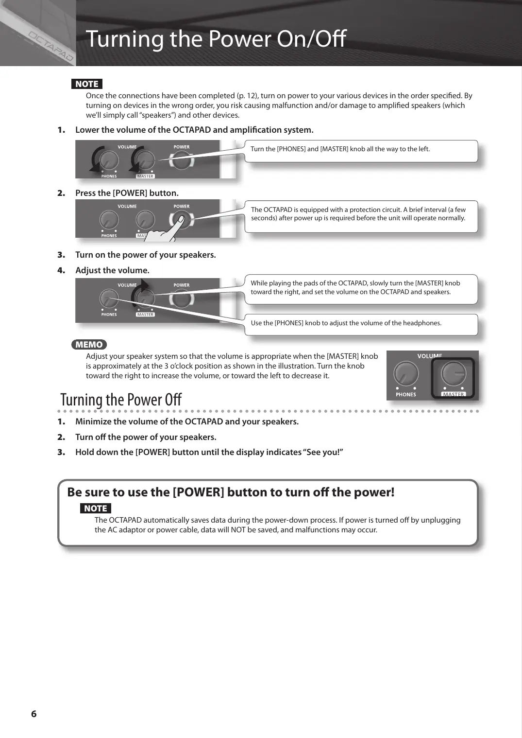 Be sure to use the [POWER] button to turn off the power! The OCTAPAD automatically saves data during the power-down process. If power is turned off by unplugging the AC adaptor or power cable, data will NOT be saved, and malfunctions may occur.