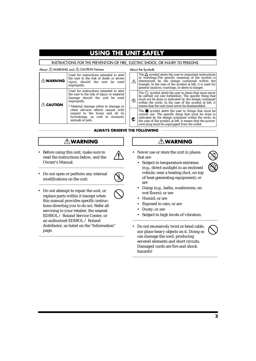 - Do not attempt to repair the unit, or replace parts within it (except when this manual provides specific instructions directing you to do so). Refer all servicing to your retailer, the nearest EDIROL / Roland Service Center, or an authorized EDIROL / Roland distributor, as listed on the "Information" page.