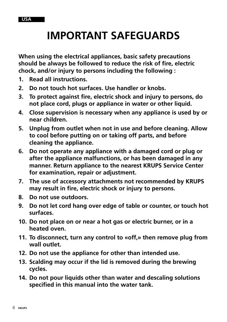 after the appliance malfunctions, or has been damaged in any manner. Return appliance to the nearest KRUPS Service Center for examination, repair or adjustment.