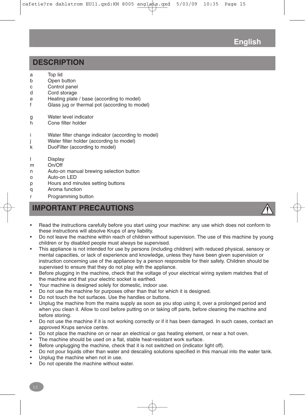 Read the instructions carefully before you start using your machine: any use which does not conform to these instructions will absolve Krups of any liability.