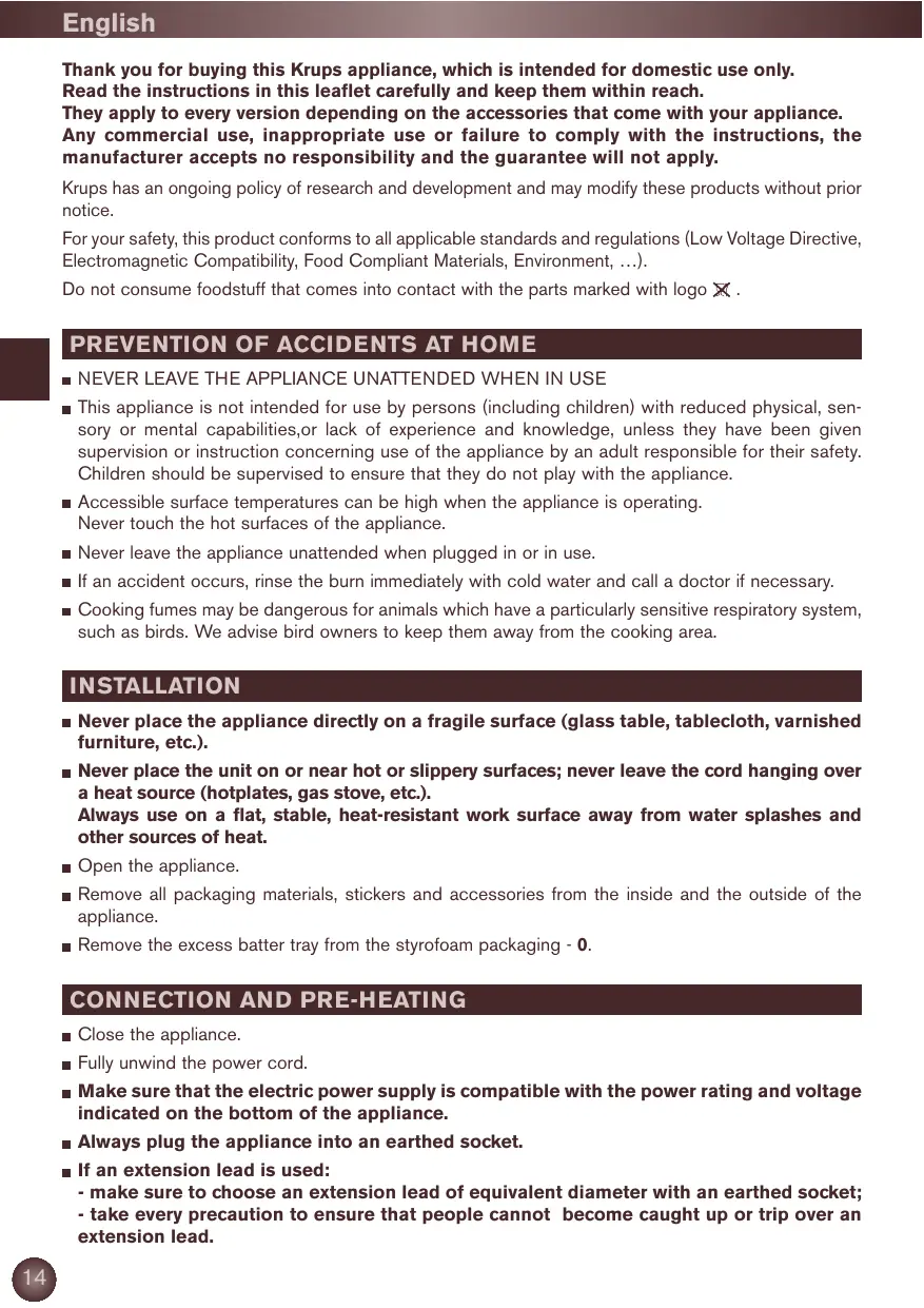English Thank you for buying this Krups appliance, which is intended for domestic use only. Read the instructions in this leaflet carefully and keep them within reach. They apply to every version depending on the accessories that come with your appliance. Any commercial use, inappropriate use or failure to comply with the instructions, the manufacturer accepts no responsibility and the guarantee will not apply. Krups has an ongoing policy of research and development and may modify these products without prior notice. For your safety, this product conforms to all applicable standards and regulations (Low Voltage Directive, Electromagnetic Compatibility, Food Compliant Materials, Environment, …). Do not consume foodstuff that comes into contact with the parts marked with logo