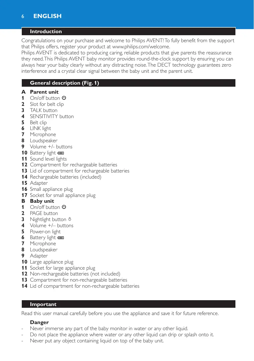 Parent unit On/off button 3 Slot for belt clip TALK button SENSITIVITY button Belt clip LINK light Microphone Loudspeaker Volume +/- buttons Battery light T Sound level lights Compartment for rechargeable batteries Lid of compartment for rechargeable batteries Rechargeable batteries (included) Adapter Small appliance plug Socket for small appliance plug Baby unit On/off button 3 PAGE button Nightlight button Q Volume +/– buttons Power-on light Battery light T Microphone Loudspeaker Adapter Large appliance plug Socket for large appliance plug Non-rechargeable batteries (not included) Compartment for non-rechargeable batteries Lid of compartment for non-rechargeable batteries Important Read this user manual carefully before you use the appliance and save it for future reference. Danger -- Never immerse any part of the baby monitor in water or any other liquid. -- Do not place the appliance where water or any other liquid can drip or splash onto it. -- Never put any object containing liquid on top of the baby unit. English