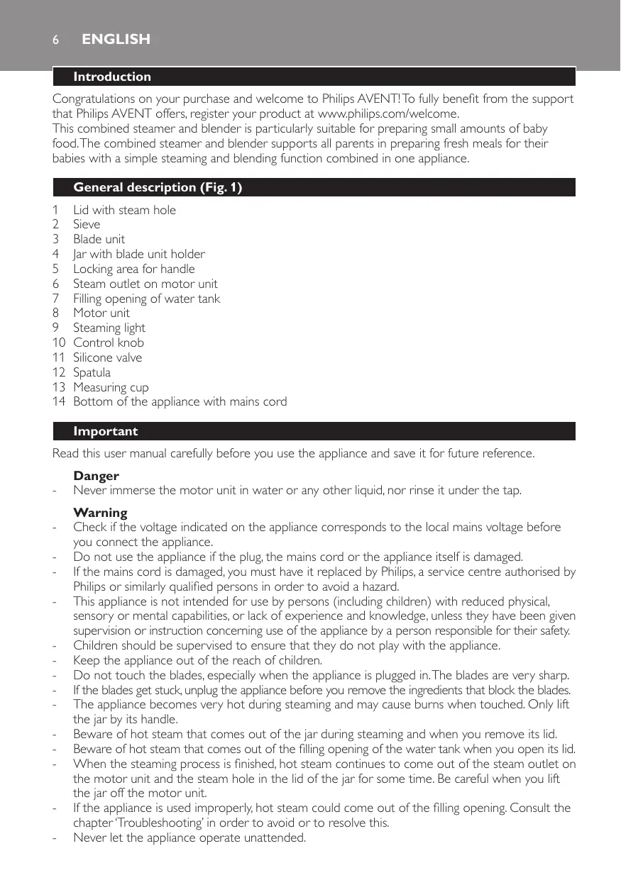 English Introduction Congratulations on your purchase and welcome to Philips AVENT! To fully benefit from the support that Philips AVENT offers, register your product at www.philips.com/welcome. This combined steamer and blender is particularly suitable for preparing small amounts of baby food. The combined steamer and blender supports all parents in preparing fresh meals for their babies with a simple steaming and blending function combined in one appliance. General description (Fig. 1)