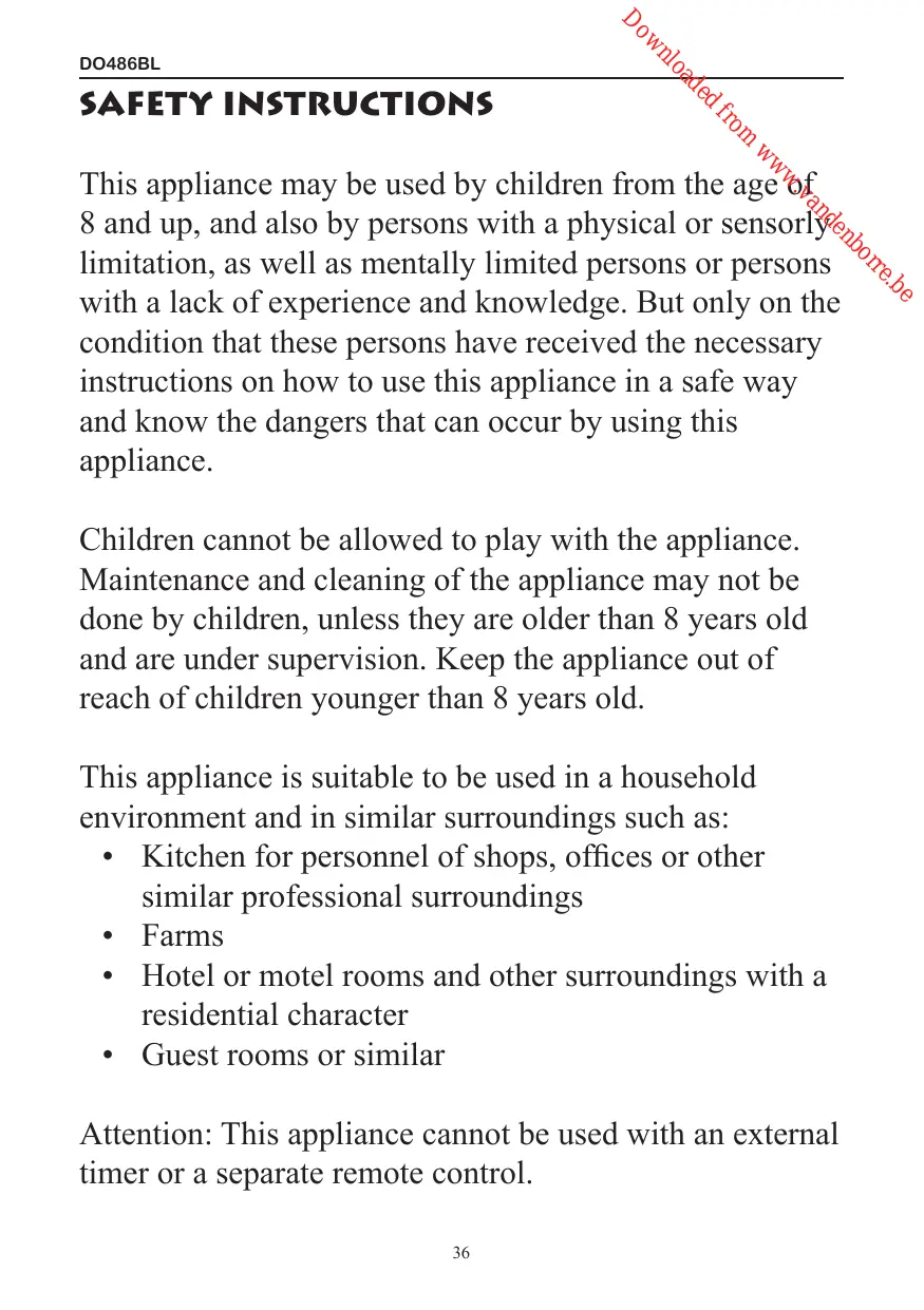 Children cannot be allowed to play with the appliance. Maintenance and cleaning of the appliance may not be done by children, unless they are older than 8 years old and are under supervision. Keep the appliance out of reach of children younger than 8 years old.