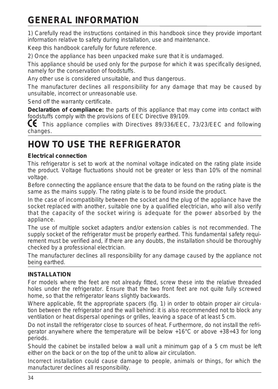 1) Carefully read the instructions contained in this handbook since they provide important information relative to safety during installation, use and maintenance. Keep this handbook carefully for future reference. 2) Once the appliance has been unpacked make sure that it is undamaged. This appliance should be used only for the purpose for which it was specifically designed, namely for the conservation of foodstuffs. Any other use is considered unsuitable, and thus dangerous. The manufacturer declines all responsibility for any damage that may be caused by unsuitable, incorrect or unreasonable use. Send off the warranty certificate. Declaration of compliance: the parts of this appliance that may come into contact with foodstuffs comply with the provisions of EEC Directive 89/109. This appliance complies with Directives 89/336/EEC, 73/23/EEC and following changes.