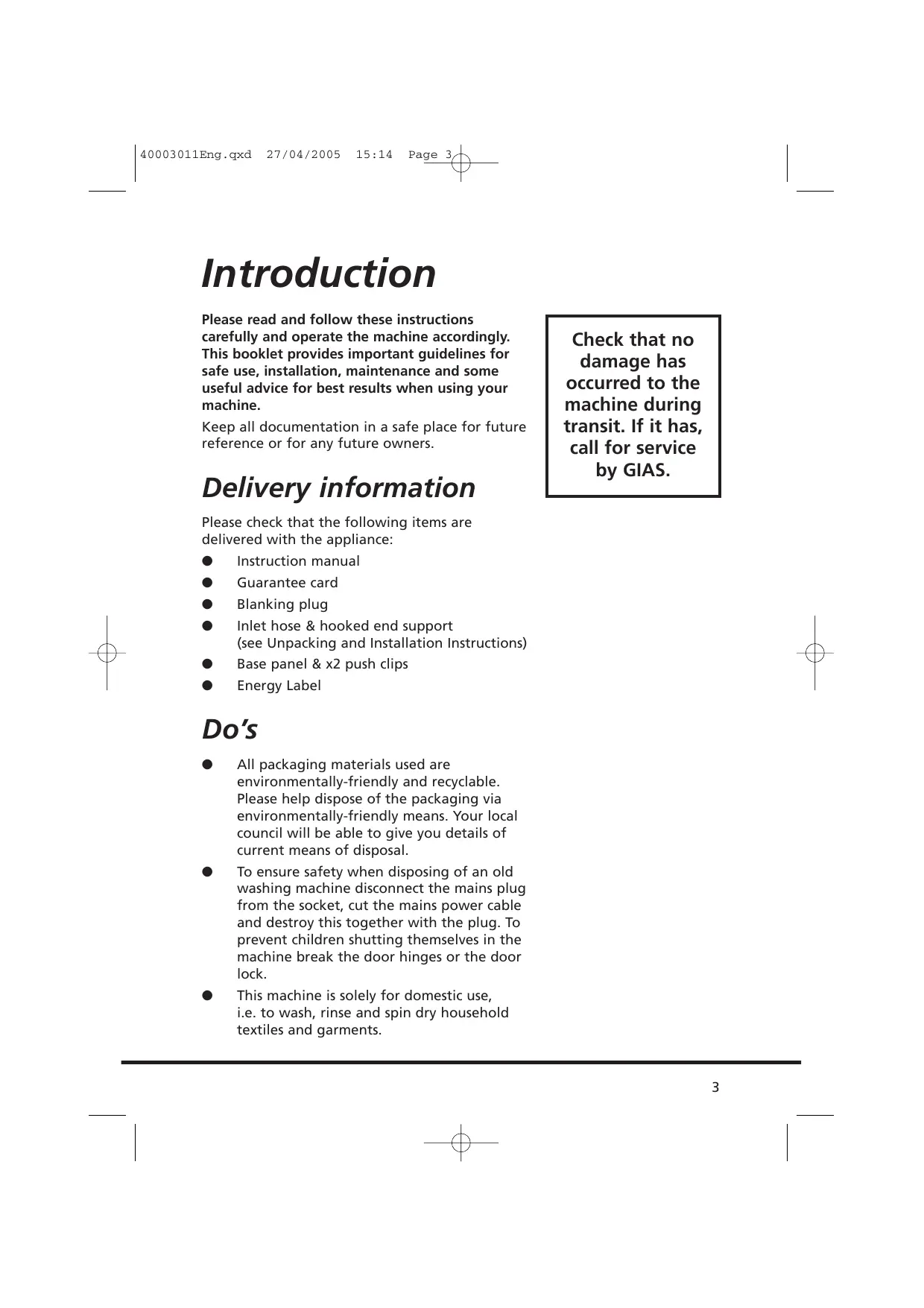 40003011Eng.qxd 27/04/2005 15:14 Page 3 Introduction Please read and follow these instructions carefully and operate the machine accordingly. This booklet provides important guidelines for safe use, installation, maintenance and some useful advice for best results when using your machine. Keep all documentation in a safe place for future reference or for any future owners. Delivery information Check that no damage has occurred to the machine during transit. If it has, call for service by GIAS. Please check that the following items are delivered with the appliance:
