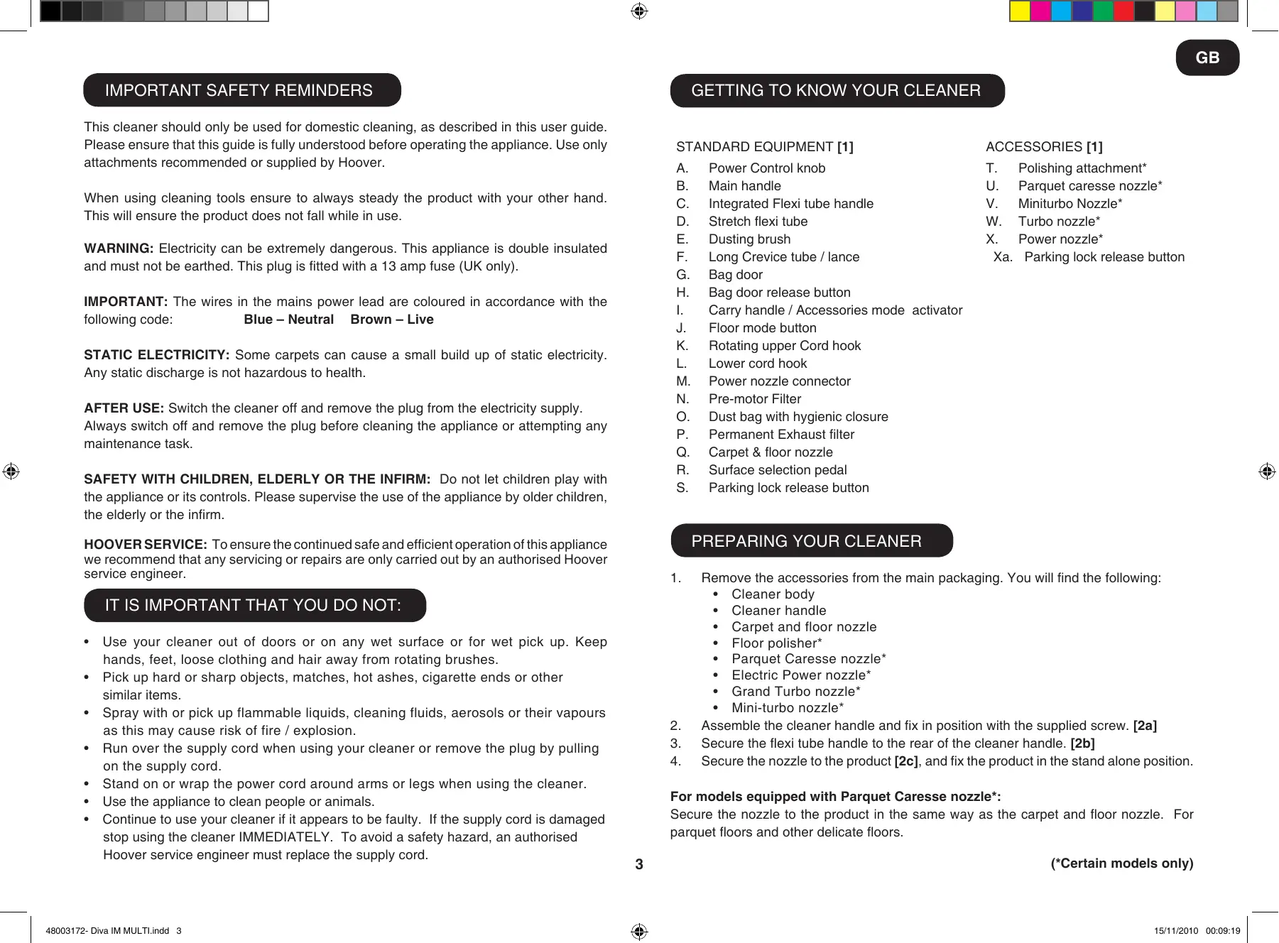 Use your cleaner out of doors or on any wet surface or for wet pick up. Keep hands, feet, loose clothing and hair away from rotating brushes. Pick up hard or sharp objects, matches, hot ashes, cigarette ends or other similar items. Spray with or pick up flammable liquids, cleaning fluids, aerosols or their vapours as this may cause risk of fire / explosion. Run over the supply cord when using your cleaner or remove the plug by pulling on the supply cord. Stand on or wrap the power cord around arms or legs when using the cleaner. Use the appliance to clean people or animals. Continue to use your cleaner if it appears to be faulty. If the supply cord is damaged stop using the cleaner IMMEDIATELY. To avoid a safety hazard, an authorised Hoover service engineer must replace the supply cord. Polishing attachment* Parquet caresse nozzle* Miniturbo Nozzle* Turbo nozzle* Power nozzle* Parking lock release button