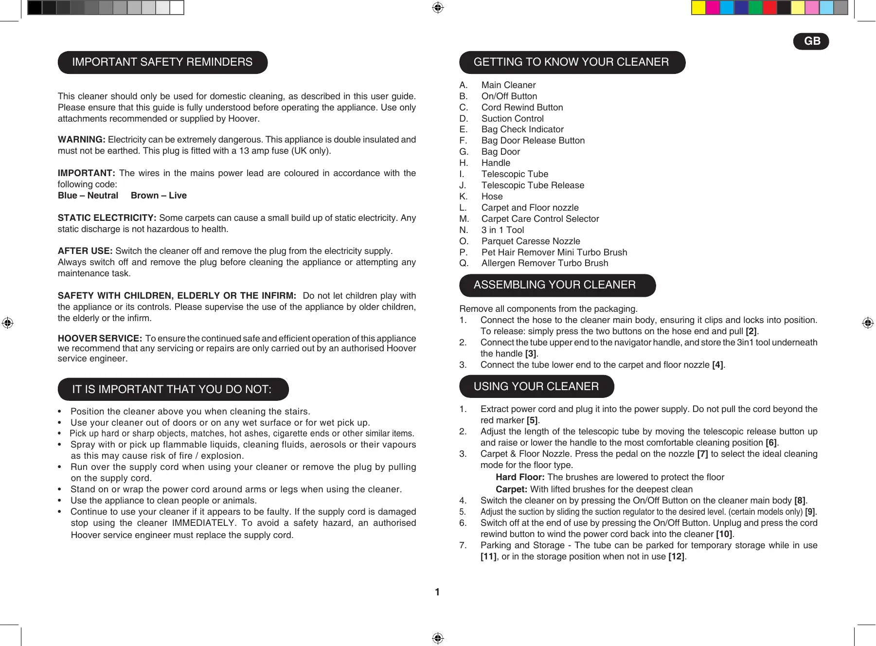 By ensuring this product is disposed of correctly you will help prevent potential negative consequences for the environment and human health, which could otherwise be caused by inappropriate waste handling of this product. The symbol on the product indicates that this product may not be treated as houshold waste. Instead it shall be handed over to the appliance collection point for recycling of electrical and electronic equipment. Disposal must be carried out in accordance with the local environmental regulations for waste disposal. Hoover Service Should you require service at any time, please contact your local Hoover Service Office. For more detailed information about treatment, recovery and recycling of this product, please contact your local city office, your household waste disposal service or the shop where you purchased the product. Quality, Safety and the Environment Your Guarantee Safety The guarantee conditions for this appliance are as defined by our representative in the country in which it is sold. Details regarding these conditions can be obtained from the dealer from whom the appliance was purchased. The bill of sale or receipt must be produced when making any claim under the terms of this guarantee. Although safety certification of electrical appliances is not required by law in the UK, Hoover believe that independent approval is the best way of demonstrating safety in design and manufacture. The British Electrotechnical Approvals Board (BEAB), the independent UK national authority for the safety of domestic electrical appliances, ensures that European safety standards are met and maintained throughout the production life of an appliance. All appliances that pass the requirements are permitted to carry the BEAB mark of safety. Subject to change without notice. Quality BSI ISO 9001 Hoover’s factories have been independently assessed for quality. Our products are made using a quality system which meets the requirements of ISO 9001.