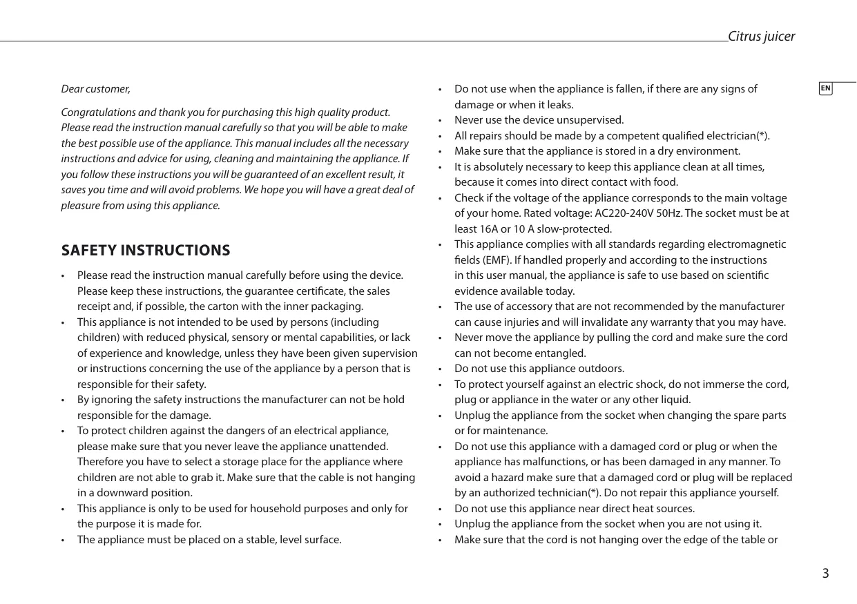 Congratulations and thank you for purchasing this high quality product. Please read the instruction manual carefully so that you will be able to make the best possible use of the appliance. This manual includes all the necessary instructions and advice for using, cleaning and maintaining the appliance. If you follow these instructions you will be guaranteed of an excellent result, it saves you time and will avoid problems. We hope you will have a great deal of pleasure from using this appliance.