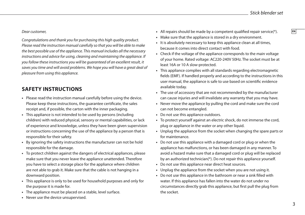 Congratulations and thank you for purchasing this high quality product. Please read the instruction manual carefully so that you will be able to make the best possible use of the appliance. This manual includes all the necessary instructions and advice for using, cleaning and maintaining the appliance. If you follow these instructions you will be guaranteed of an excellent result, it saves you time and will avoid problems. We hope you will have a great deal of pleasure from using this appliance.