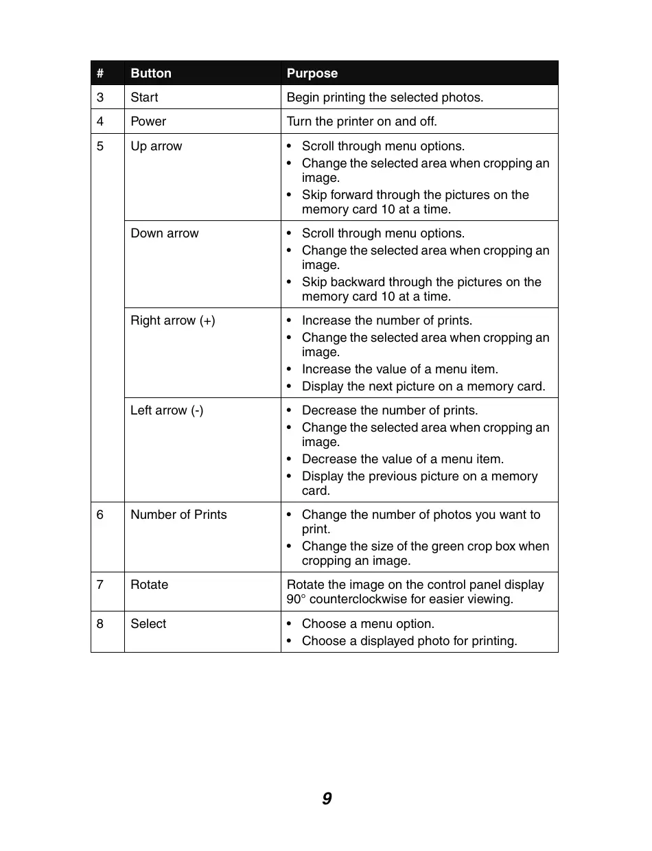 If Preview before Print is on, a preview of the print job is first displayed. Press Start again to print the photo. If Preview before Print is off, the photo prints immediately. Note: To adjust the Preview setting, see page 23. Cropping a photo 1 Load photo paper. 2 Insert a memory card. Note: If you are unsure of what type of memory card you have, see page 11. The I Want To... menu appears with View Photos or Print highlighted. 3 Press Select. 4 Press the right or left arrow buttons to scroll to the photo you want to adjust. 5 Press Menu. The Photo menu appears. 6 Press the down arrow button until you highlight Crop. 7 Press Select. 8 Adjust the green crop box over the photo. Press the arrow buttons to move the crop box. Press Number Of Prints to change the size of the crop box. 9 Press Select to accept your changes. To adjust other photos, repeat steps 4–9. 10 Press Start to print the photo(s). If Preview before Print is on, a preview of the print job is first displayed. Press Start again to print the photo.