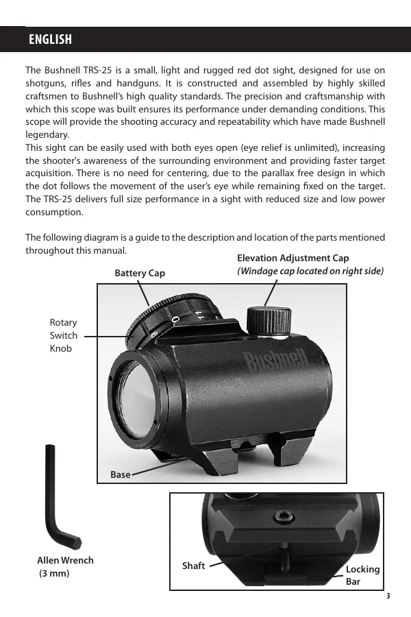 ENGLISH The Bushnell TRS-25 is a small, light and rugged red dot sight, designed for use on shotguns, rifles and handguns. It is constructed and assembled by highly skilled craftsmen to Bushnell’s high quality standards. The precision and craftsmanship with which this scope was built ensures its performance under demanding conditions. This scope will provide the shooting accuracy and repeatability which have made Bushnell legendary. This sight can be easily used with both eyes open (eye relief is unlimited), increasing the shooter's awareness of the surrounding environment and providing faster target acquisition. There is no need for centering, due to the parallax free design in which the dot follows the movement of the user’s eye while remaining fixed on the target. The TRS-25 delivers full size performance in a sight with reduced size and low power consumption. The following diagram is a guide to the description and location of the parts mentioned throughout this manual. Elevation Adjustment Cap (Windage cap located on right side) Battery Cap Rotary Switch Knob Base Allen Wrench (3 mm) Shaft Locking Bar