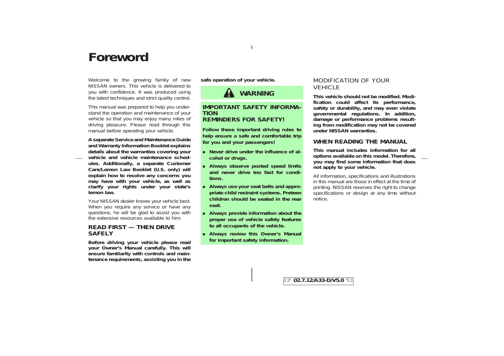 MAXIMA 2003 - Berline NISSAN - Free user manual and instructions