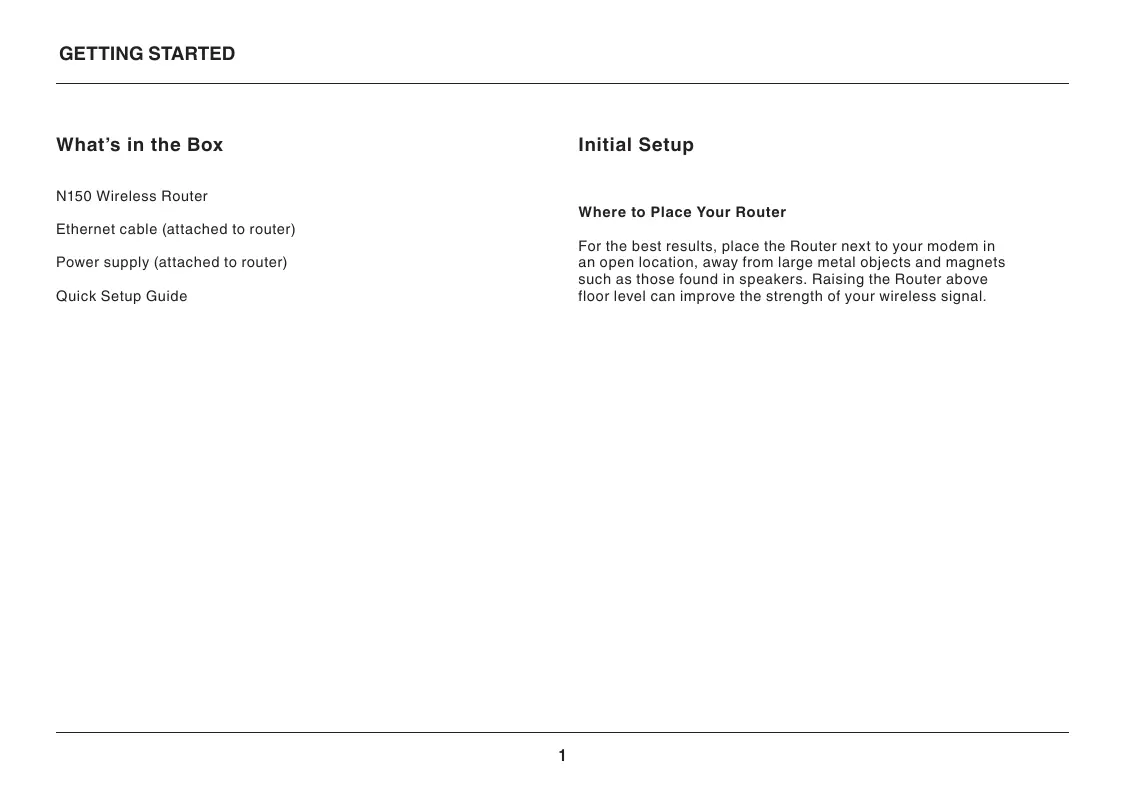 GETTING STARTED How to Set It Up Connect Your N150 Router Turn off your modem by disconnecting its power supply. Some modems have a battery backup; this will need to be disconnected at this time as well. Connect your Router to your modem using the cable (already attached). Power up your modem by plugging in its power supply. If your modem has a battery backup, it can be reconnected at this time; you may need to hold the reset button for 10 seconds. Power up your Router by plugging in its power supply.