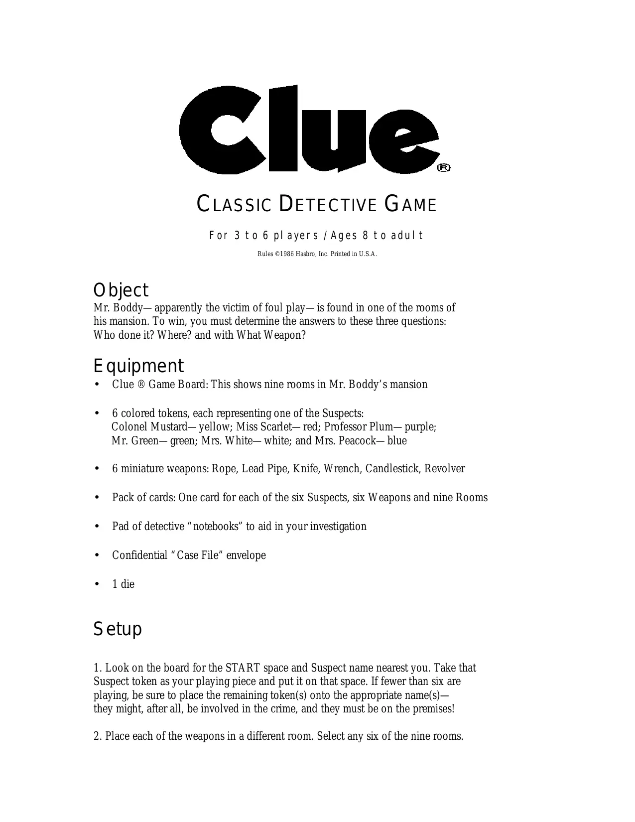 Clue CLassic DETECTIVE GAME For 3to 6 players /Ages 8 to adult Rules 61986 Hasbro, Inc. Printed in U.S.A Object Mr. Boddy— apparently the victim of foul play— is found in one of the rooms of his mansion. To win, you must determine the answers to these three questions: Who done it? Where? and with What Weapon? Equipment Clue ® Game Board: This shows nine rooms in Mr. Boddy's mansion + 6 colored tokens, each representing one of the Suspects: Colonel Mustard— yellow; Miss Scarlet— red; Professor Plum— purple; Mr. Green— green; Mrs. White— white; and Mrs. Peacock— blue + 6 miniature weapons: Rope, Lead Pipe, Knife, Wrench, Candlestick, Revolver + Pack of cards: One card for each of the six Suspects, six Weapons and nine Rooms + Pad of detective “notebooks” to aid in your investigation + Confidential “Case File” envelope + die Setup