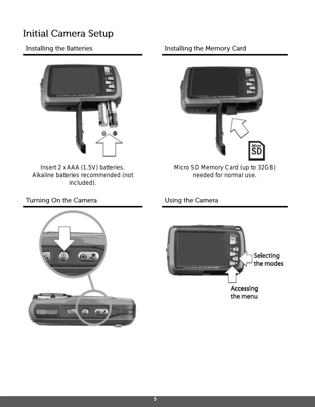 Batteries Make sure the batteries have been inserted properly into your digital camera, according to the polarity shown inside the battery compartment. Use 2x AAA (1.5V) batteries. Alkaline batteries are recommended. (Batteries not included.) Note: