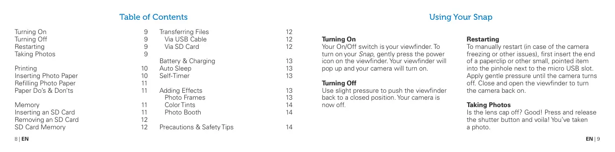 To manually restart (in case of the camera freezing or other issues), first insert the end of a paperclip or other small, pointed item into the pinhole next to the micro USB slot. Apply gentle pressure until the camera turns off. Close and open the viewfinder to turn the camera back on. Taking Photos Is the lens cap off? Good! Press and release the shutter button and voila! You’ve taken a photo. EN | 9