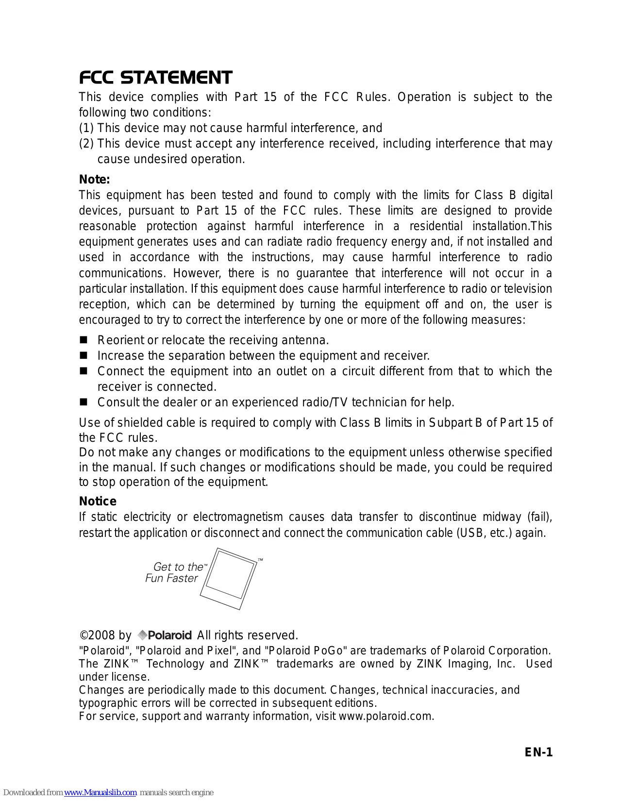 "Polaroid", "Polaroid and Pixel", and "Polaroid PoGo" are trademarks of Polaroid Corporation. The ZINK™ Technology and ZINK™ trademarks are owned by ZINK Imaging, Inc. Used under license. Changes are periodically made to this document. Changes, technical inaccuracies, and typographic errors will be corrected in subsequent editions. For service, support and warranty information, visit www.polaroid.com.