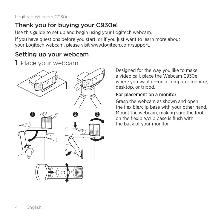 For placement on a monitor Grasp the webcam as shown and open the flexible/clip base with your other hand. Mount the webcam, making sure the foot on the flexible/clip base is flush with the back of your monitor.