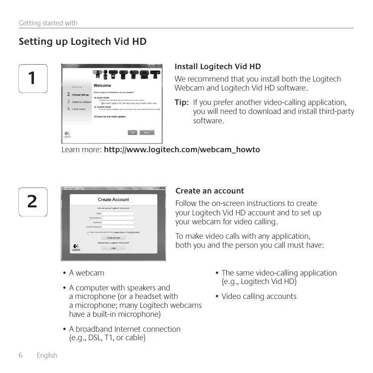 • A webcam • A computer with speakers and a microphone (or a headset with a microphone; many Logitech webcams have a built-in microphone) • A broadband Internet connection (e.g., DSL, T1, or cable) 6 English