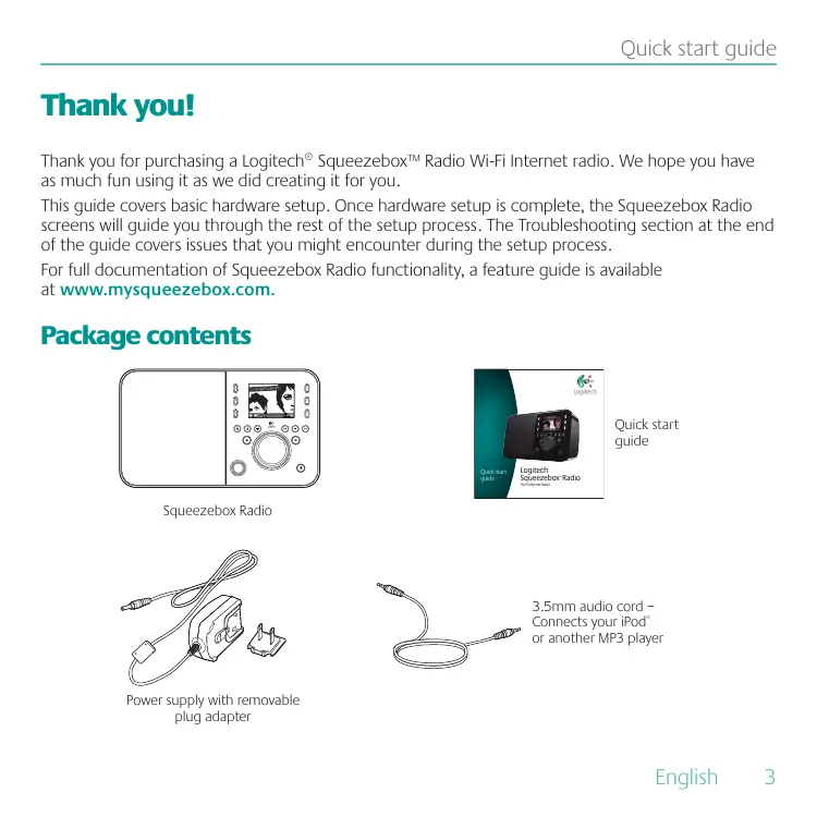Thank you! Thank you for purchasing a Logitech® Squeezebox™ Radio Wi-Fi Internet radio. We hope you have as much fun using it as we did creating it for you. This guide covers basic hardware setup. Once hardware setup is complete, the Squeezebox Radio screens will guide you through the rest of the setup process. The Troubleshooting section at the end of the guide covers issues that you might encounter during the setup process. For full documentation of Squeezebox Radio functionality, a feature guide is available at www.mysqueezebox.com. Package contents