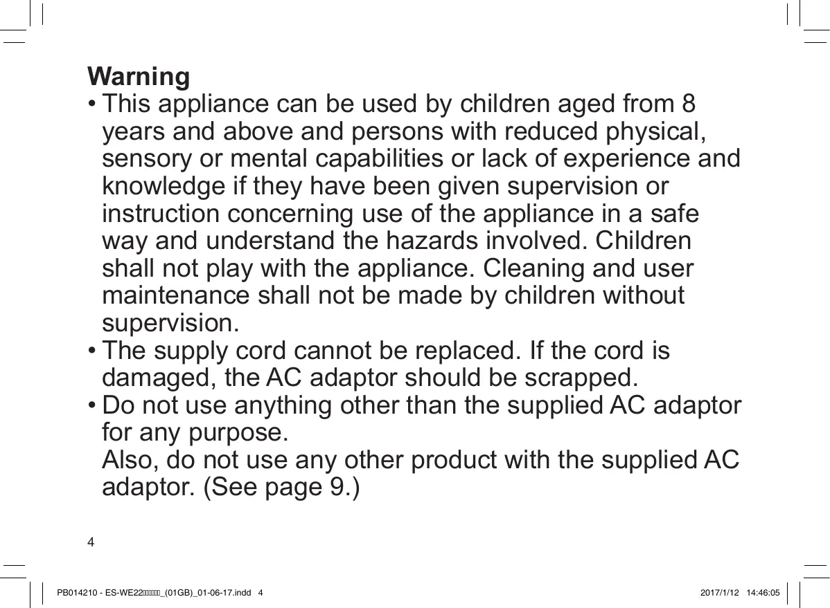 • This appliance can be used by children aged from 8 years and above and persons with reduced physical, sensory or mental capabilities or lack of experience and knowledge if they have been given supervision or instruction concerning use of the appliance in a safe way and understand the hazards involved. Children shall not play with the appliance. Cleaning and user maintenance shall not be made by children without supervision. • The supply cord cannot be replaced. If the cord is damaged, the AC adaptor should be scrapped. • Do not use anything other than the supplied AC adaptor for any purpose. Also, do not use any other product with the supplied AC adaptor. (See page 9.) 4