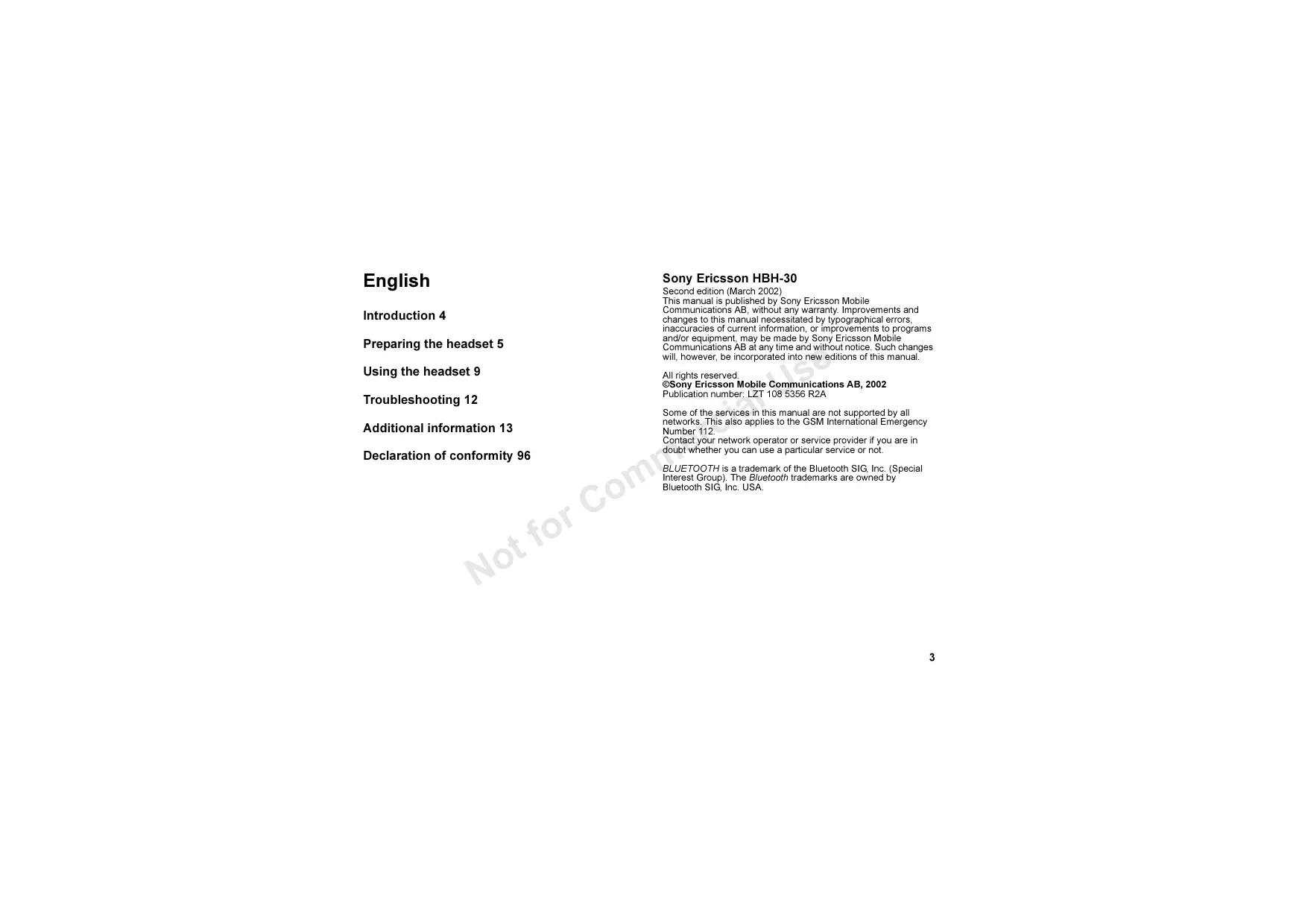 FCC Statement This device complies with Part 15 of the FCC rules. Operation is subject to the following two conditions: (1) This device may not cause harmful interference, and (2) This device must accept any interference received, including interference that may cause undesired operation. Sony Ericsson HBH-30 Second edition (March 2002) This manual is published by Sony Ericsson Mobile Communications AB, without any warranty. Improvements and changes to this manual necessitated by typographical errors, inaccuracies of current information, or improvements to programs and/or equipment, may be made by Sony Ericsson Mobile Communications AB at any time and without notice. Such changes will, however, be incorporated into new editions of this manual. Introduction 4 Preparing the headset 5 Using the headset 9 Troubleshooting 12 Some of the services in this manual are not supported by all networks. This also applies to the GSM International Emergency Number 112. Contact your network operator or service provider if you are in doubt whether you can use a particular service or not. Additional information 13 Declaration of conformity 96