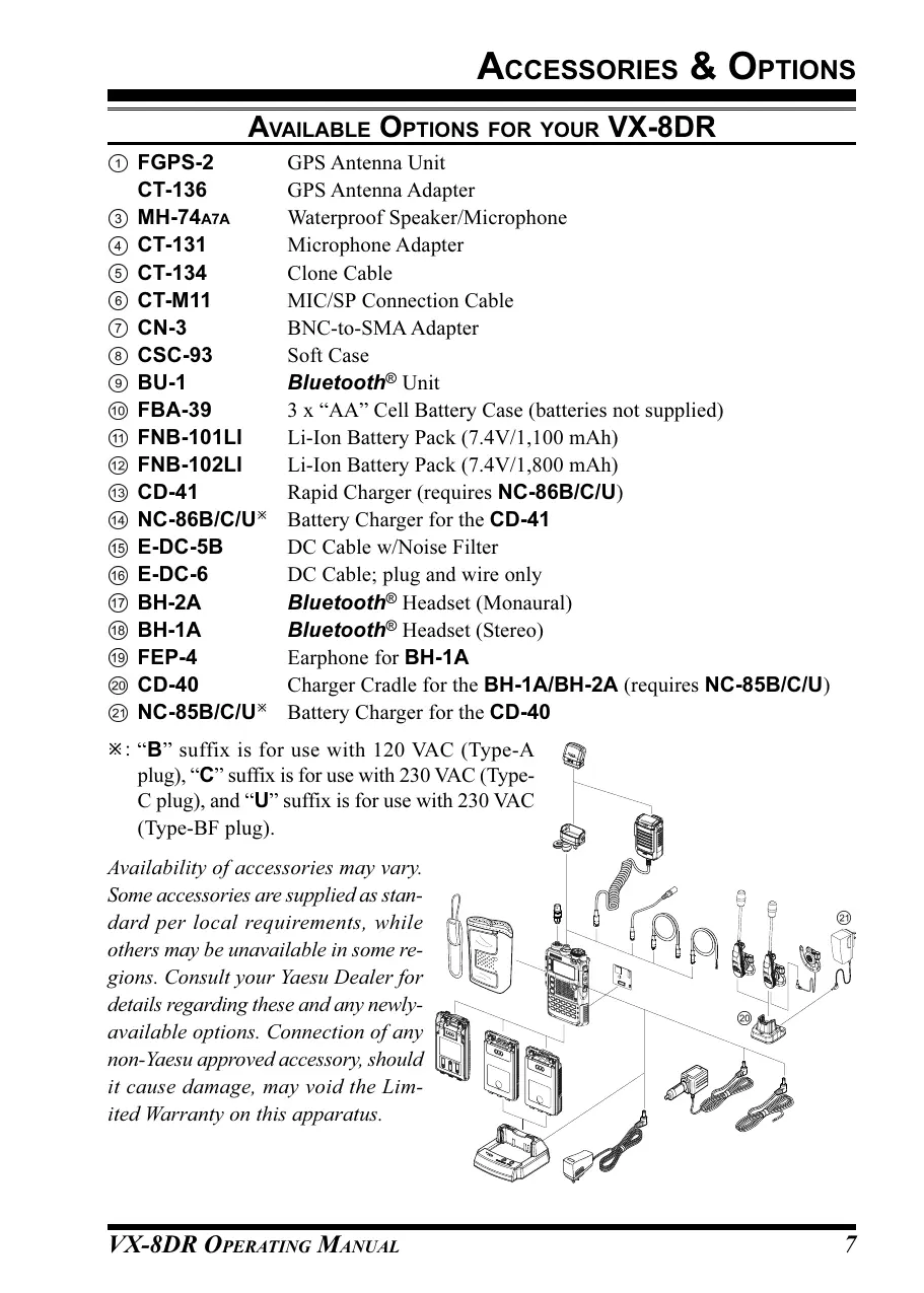 VX-8DR OPERATING MANUAL ACCESSORIES & OPTIONS AVAILABLE OPTIONS FOR YOUR VX-8DR FGPS-2 CT-136 MH-74A7A CT-131 CT-134 CT-M11 CN-3 CSC-93 BU-1 FBA-39 FNB-101LI FNB-102LI CD-41 NC-86B/C/U E-DC-5B E-DC-6 BH-2A BH-1A FEP-4 CD-40