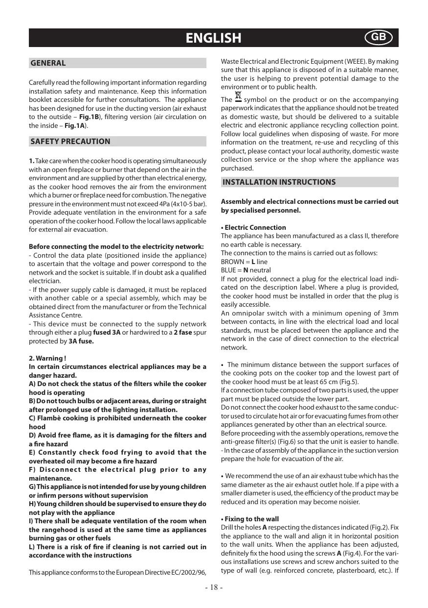 Carefully read the following important information regarding installation safety and maintenance. Keep this information booklet accessible for further consultations. The appliance has been designed for use in the ducting version (air exhaust to the outside - Fig.1B), filtering version (air circulation on the inside - Fig.1A).