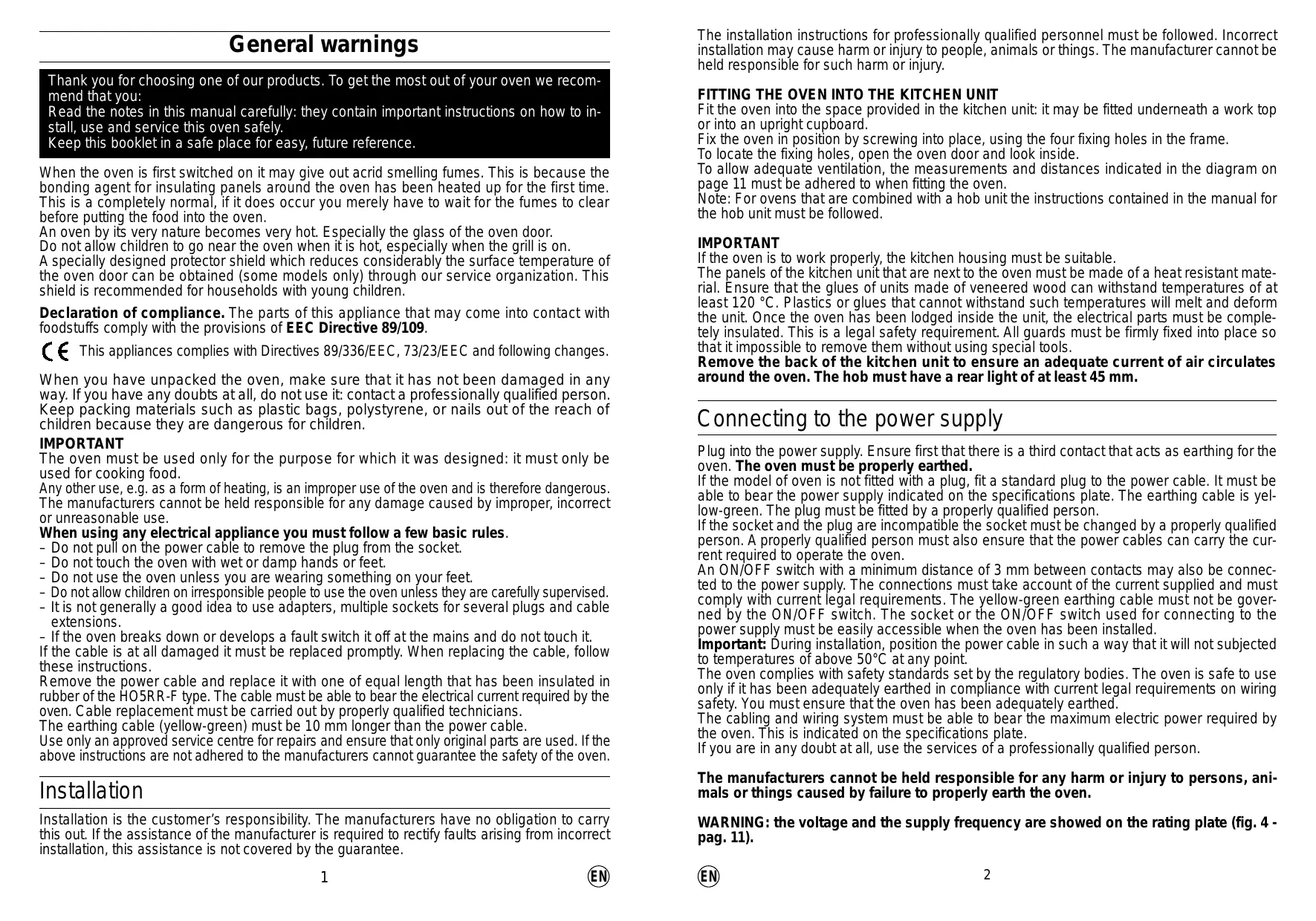 The manufacturers cannot be held responsible for any harm or injury to persons, animals or things caused by failure to properly earth the oven.