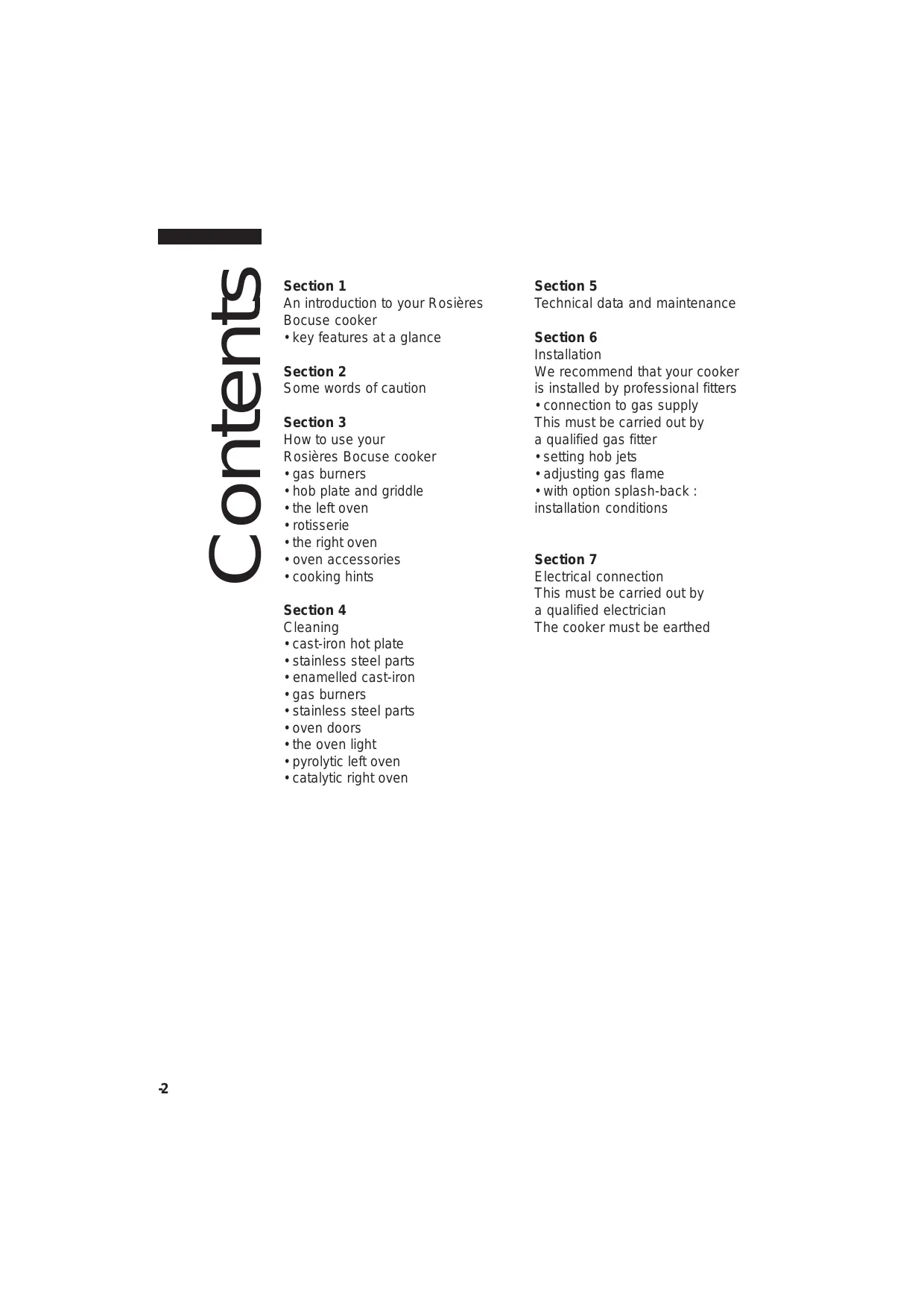 Section 2 Some words of caution We want you to get maximum pleasure and benefit from your Rosières Bocuse cooker. But before we guide you through its many features, permit us to offer. a few important words of caution for your well-being and that of your cooker. We recommend that your cooker is: • professionally installed • it must be connected to the fuel supply by a qualified electrician and gas fitter • earthed