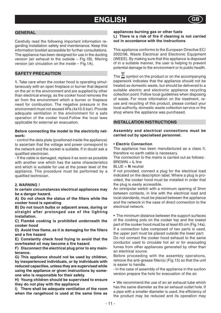 Carefully read the following important information regarding installation safety and maintenance. Keep this information booklet accessible for further consultations. The appliance has been designed for use in the ducting version (air exhaust to the outside - Fig.1B), filtering version (air circulation on the inside - Fig.1A).