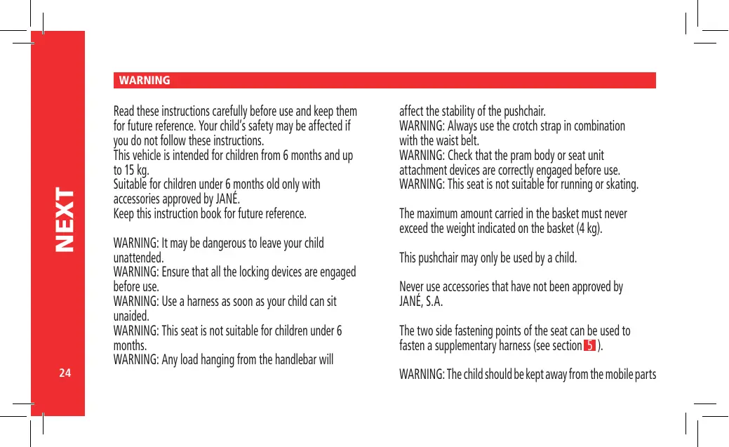 This vehicle is intended for children from 6 months and up to 15 kg. Suitable for children under 6 months old only with accessories approved by JANÉ. Keep this instruction book for future reference. WARNING: It may be dangerous to leave your child unattended. WARNING: Ensure that all the locking devices are engaged before use. WARNING: Use a harness as soon as your child can sit unaided. WARNING: This seat is not suitable for children under 6 months. WARNING: Any load hanging from the handlebar will