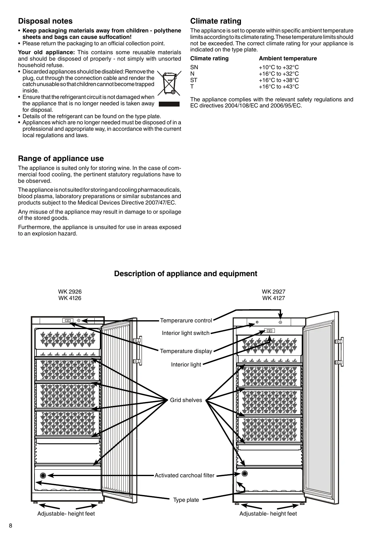 Disposal notes + Keep packaging materials away from children - polythene Sheets and bags can cause suffocation! - Please return the packaging to an official collection point. Your old appliance: This contains some reusable materials and should be disposed of properly - not simply with unsorted household refuse. - Discarded appliances should be disabled: Removethe plug, cut through the connection cable and render the catchunusable sothat children cannotbecome trapped inside. + Ensurethatthe refrigerant circuit is not damaged when the appliance that is no longer needed is taken away DS for disposal. + Details of the refrigerant can be found on the type plate. + Appliances which are no longer needed must be disposed of in a professional and appropriate way, in accordance with the current local regulations and laws. Range of appliance use The appliance is suited only for storing wine. In the case of com- mercial food cooling, the pertinent statutory regulations have to be observed. Theapplianceisnotsuitedforstoringandcoolingpharmaceuticals, blood plasma, laboratory preparations or similar substances and products subject to the Medical Devices Directive 2007/47/EC. Any misuse of the appliance may result in damage to or spoilage of the stored goods. Furthermore, the appliance is unsuited for use in areas exposed to an explosion hazard. Climate rating The applianceis set to operate within specific ambienttemperature limits accordingtoits climate rating. These temperature limits should not be exceeded. The correct climate rating for your appliance is indicated on the type plate. Climate rating Ambient temperature SN +10°C to +32°C N +16°C to +32°C ST +16°C to +38°C T +16°C to +43°C The appliance complies with the relevant safety regulations and EC directives 2004/108/EC and 2006/95/EC. Description of appliance and equipment WK 2926 WK 2927 WK 4126 WR 4187 È à A Temperarure control 5 Ps té Interior light switch "|| = | Monod l sa ra Il Temperature display ; se de 2 à EPPPTTTET: He) hs LKR) 2520